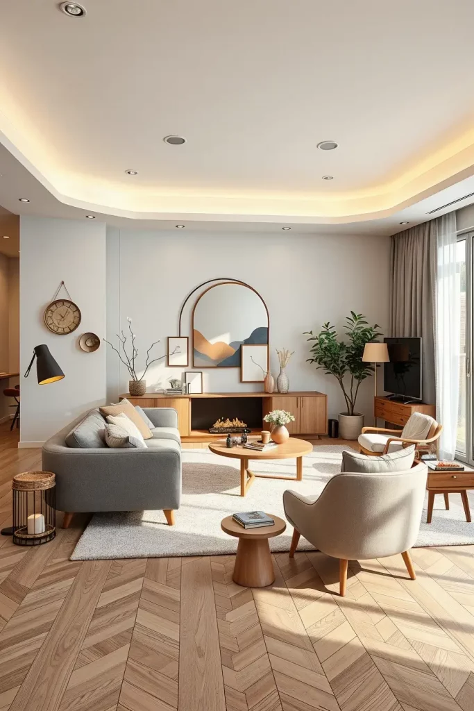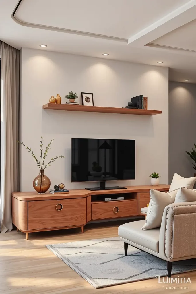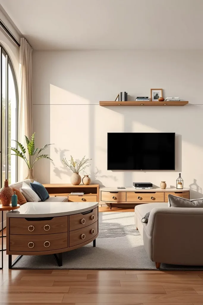 Storage is functional, but it does not imply that it should be angular and cold. To make the room flow and have harmony, I usually tend to design or purchase media consoles and storage cabinets with rounded edges and smooth lines. These works are not so intrusive and fit into a curve design storyline.