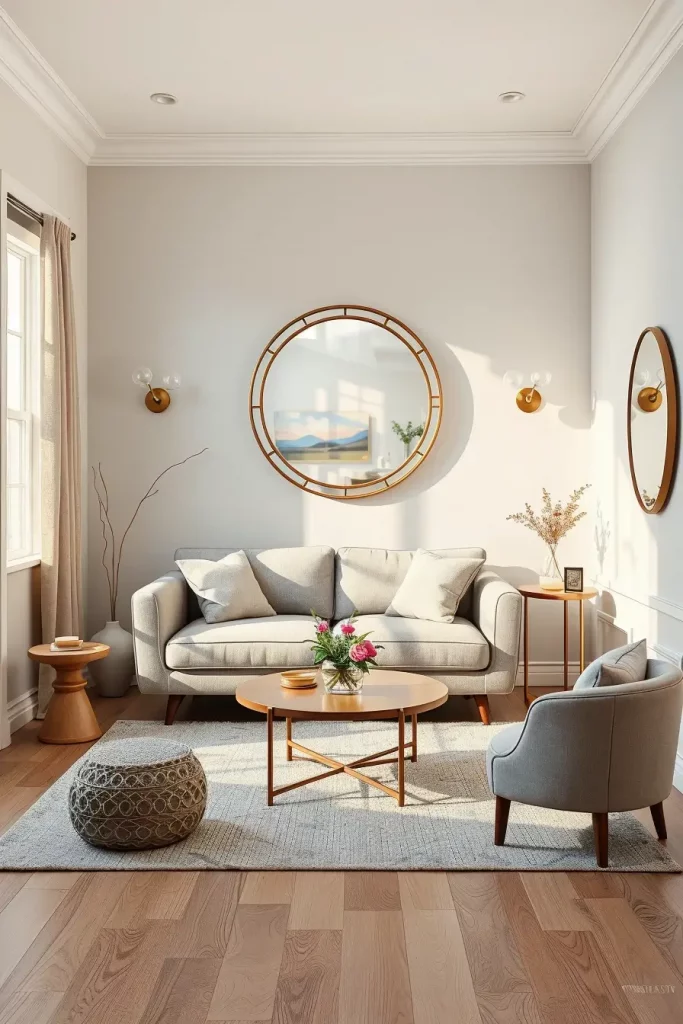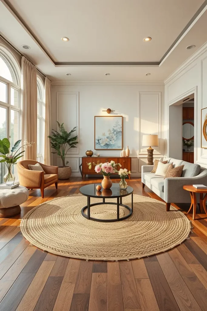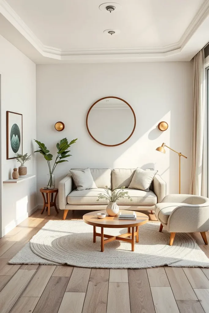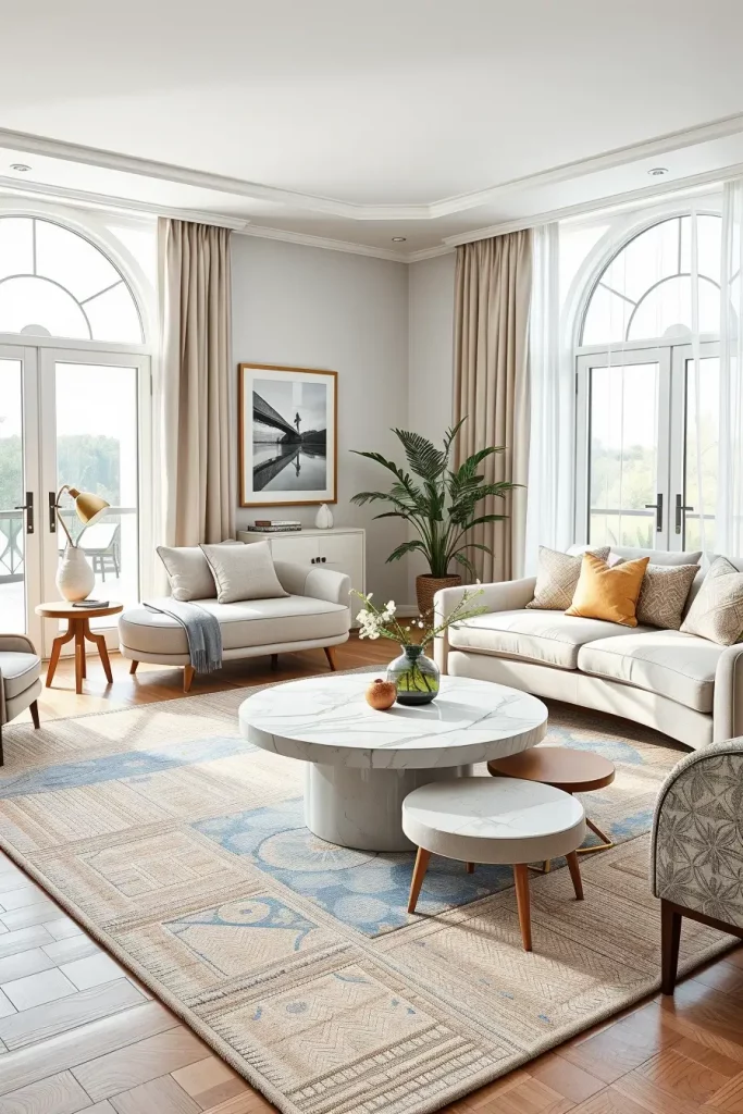 Here I am more inclined to apply a rounded loveseat or a small rounded sofa and a small round coffee table. The space is also divided with soft oval shaped rugs, and round side tables which do not give an abrupt end to the eye. This helps you establish a movement in the visual sense and this is essential in small spaces. All things are a bit less claustrophobic and inaccessible.