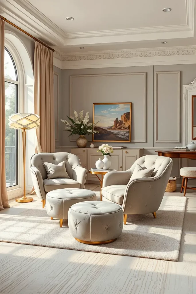 A complimentary curved ottoman or cylinder pouf may be placed around the surrounding to reinforce this arrangement. It establishes a discussion area which is purposefully cushy and welcoming.
