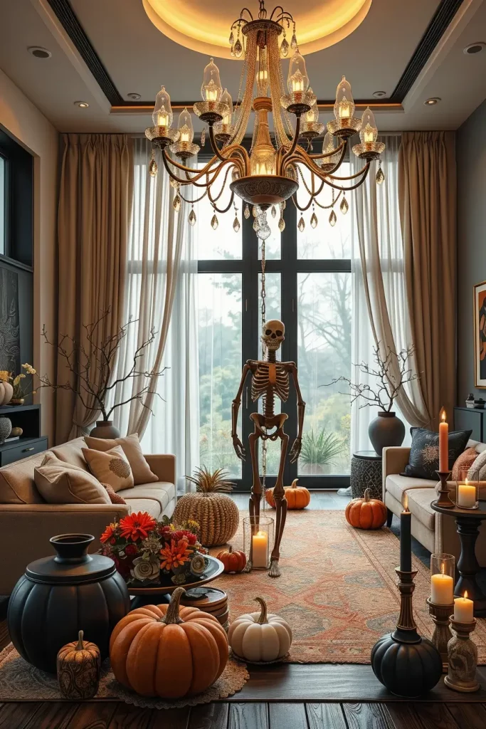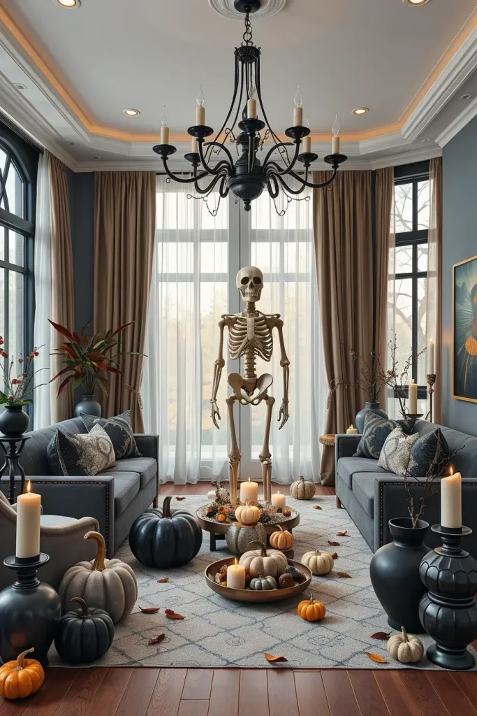 Item by item, I anchor the room with one big narrative object (a 7‑foot posable skeleton, an arched velvet screen, a wall-size decal, or a programmable LED chandelier), then add tactile accents: boucle pumpkins, velvet ribbons on taper candles, gauzy voile curtains, and matte-black ceramic vessels. In the case of tablescapes, I am partial to pressed botanicals and stoneware elegant, reusable, and trendy. I employ extra-tall candleholders or floor candelabra in wrought iron when I want to get high and dramatic in a hurry.