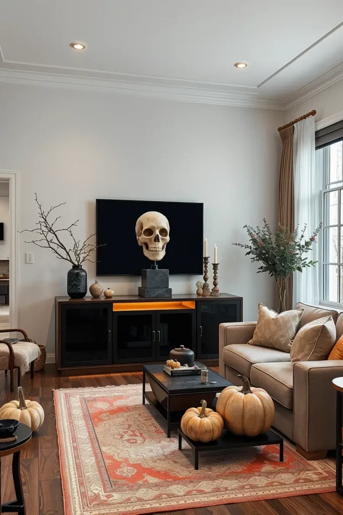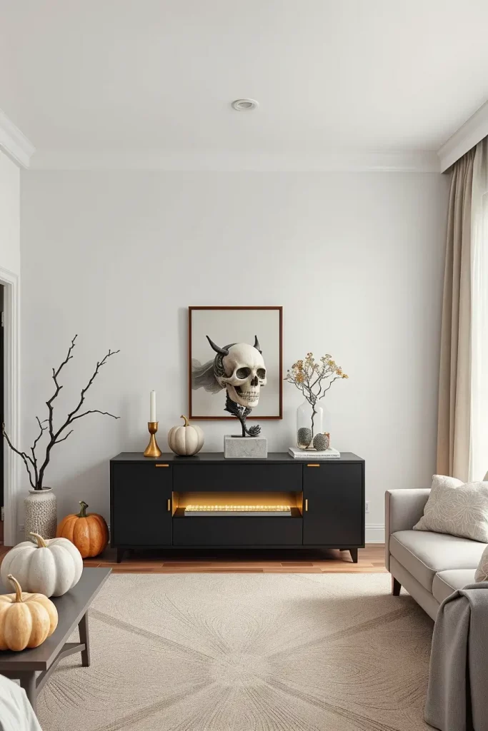 For clients who want Halloween without clutter, I design with neutral palettes (bone, mushroom, taupe, soot black) and strict editing. Negative space is included into the mood-less objects, more powerful forms. Imagine: one huge skull sculpture on a pedestal, a collection of pumpkins with a texture of stone, sheer curtains and candlelight casting long, soft shadows.