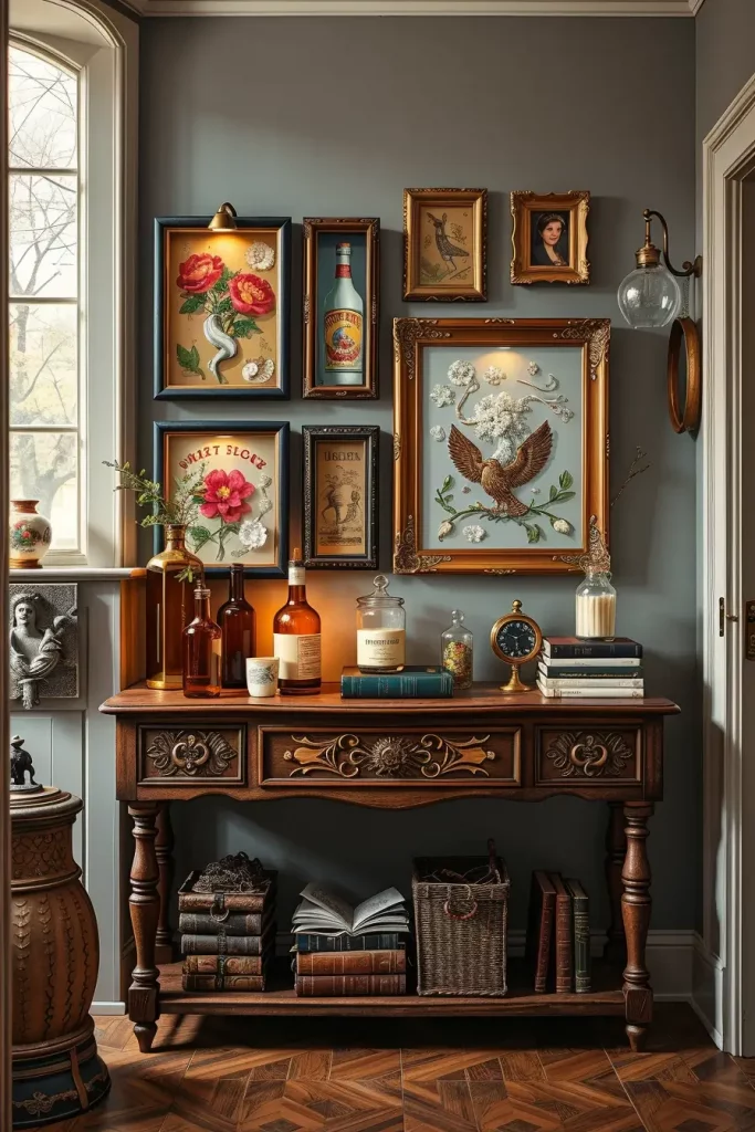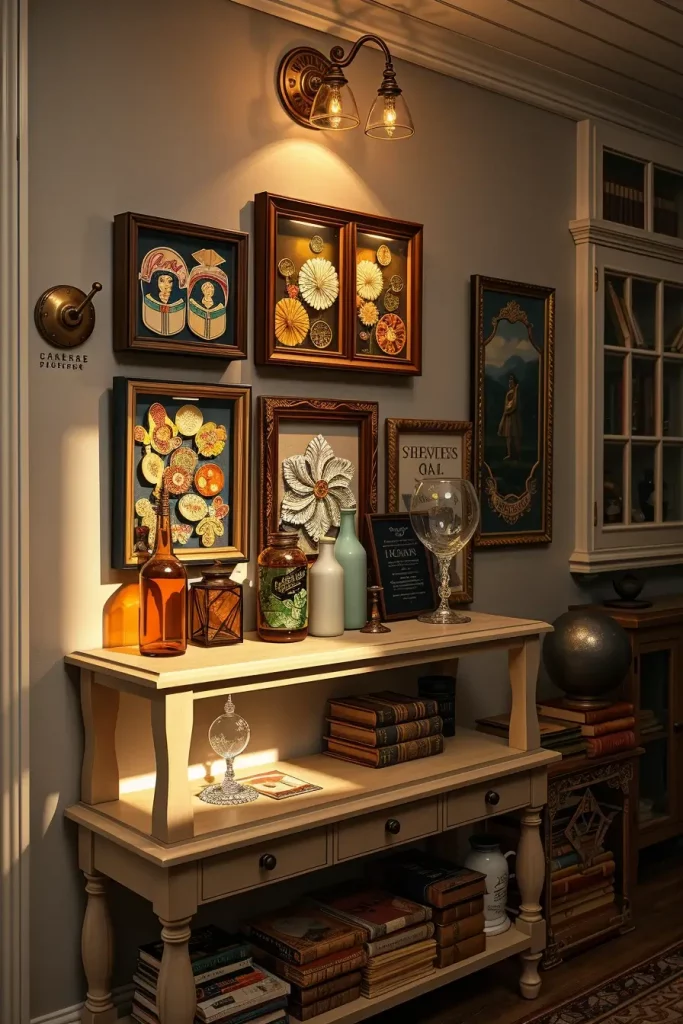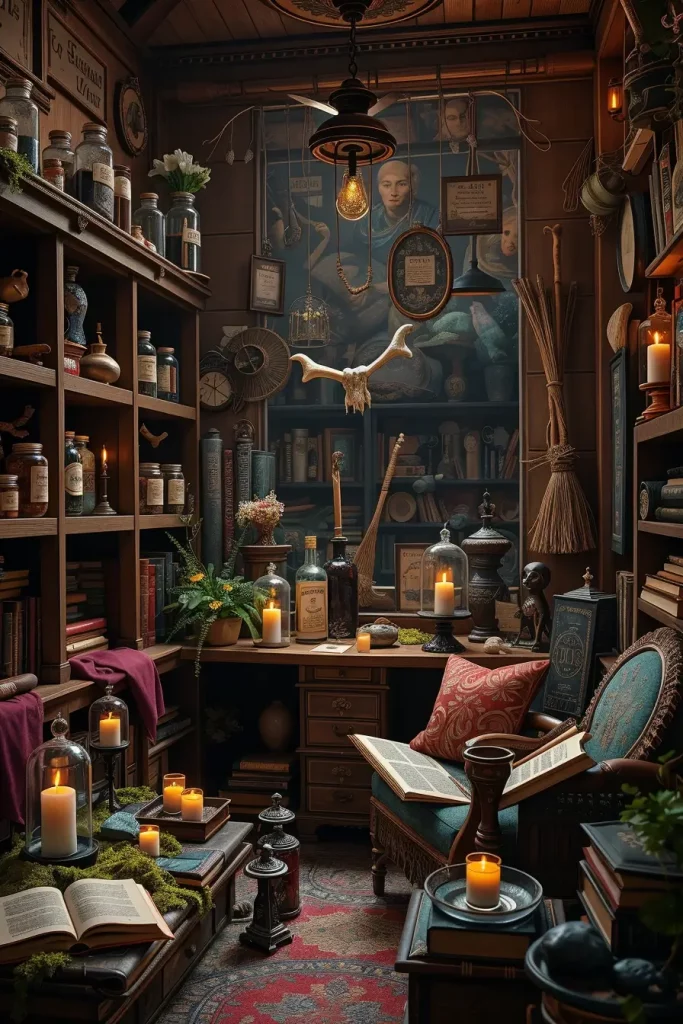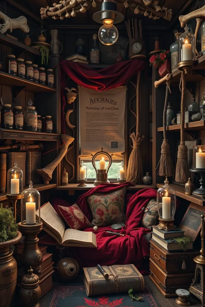 The core of it is shelves. I fill them with labeled bottles (vinegar and food coloring work for liquid “potions”), velvet-lined boxes for “bones,” and framed sigils or tarot cards. I hang feathered brooms on pegs, lay cheesecloth runners, and scatter little spellbooks in stacks nearby. A small cauldron of dry ice fog and battery lights is a beautiful center-piece, particularly at night.