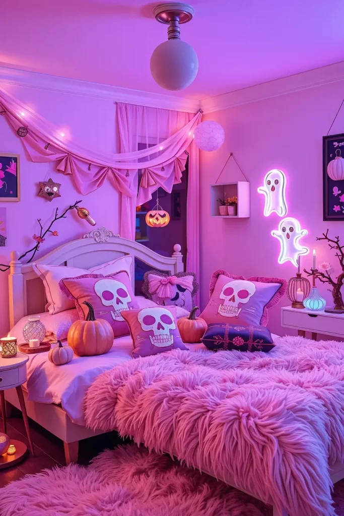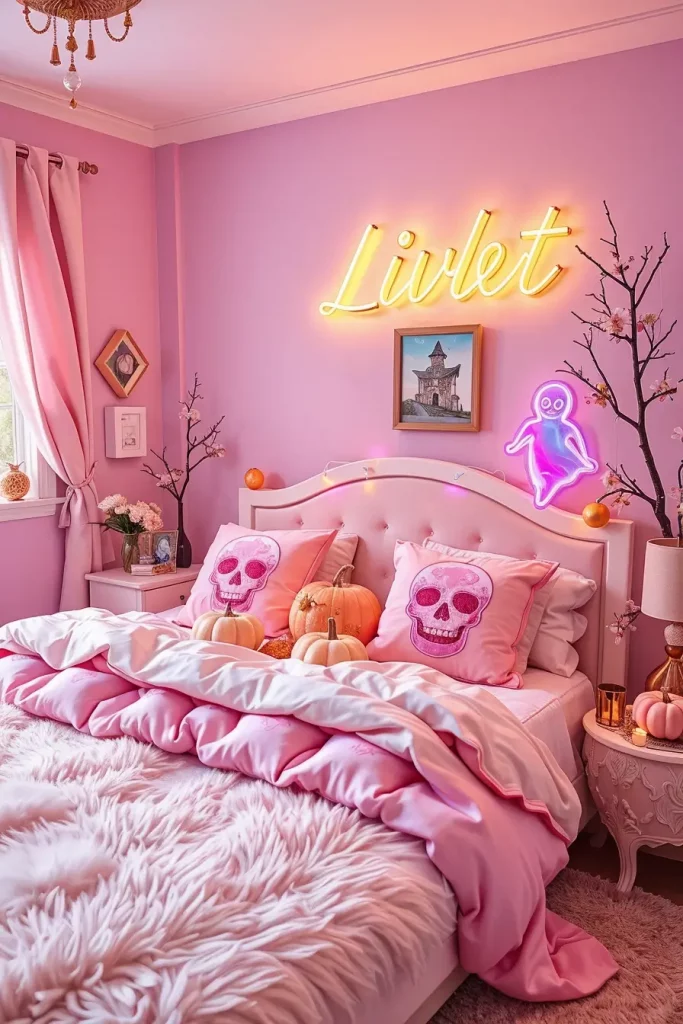 I style with pink pumpkins (plush or painted), lilac gauze drapery, rose-gold skeletons, and bone-white LED taper candles. Accent pillows with stitched spiderwebs, fuzzy pink skull throws, iridescent ghosts, and pastel neon signs (e.g., “BOO” or crescent moons) keep the mood playful. I tend to apply wall decals in the form of bats or clouds and introduce soft faux fur rugs to anchor the look.