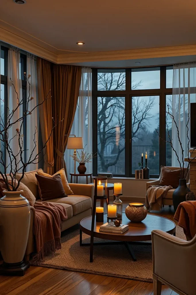 The only thing that is lacking is tactile depth. To prevent flatness, add one element of deep texture boucle pumpkins, plaster walls, or stoneware vases.