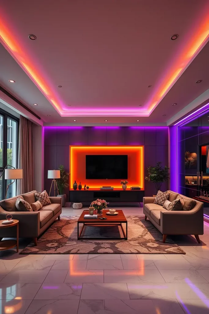 I have smart bulbs in table lamps and floor lamps, LED strips under mantels or behind sofas, pixel tape behind bookshelves or on ceilings, and motion-activated flood lights outside. I also connect devices via voice assistant or routines so I can switch entire scenes with a phrase (“Start haunt mode”). Introduce a central color scheme deep orange, cool blue, blood red and match all the lights to this.