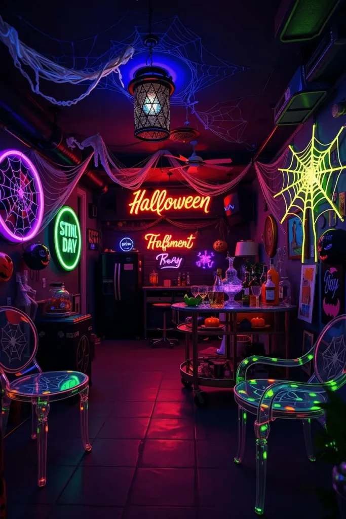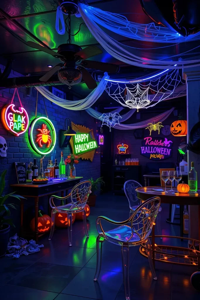 For furniture and accents, I include clear ghost chairs, acrylic bar carts with LED lighting, neon rope signs (“Creep It Real,” “Stay Spooky”), and metallic balloons that reflect colored light. Even simple things such as plastic cups, painted plastic skulls, gauze backdrops, are made to look fancy when under blacklight. There are also cheap but showstopping glow-in-the-dark spider webs and skeleton wall decals.
