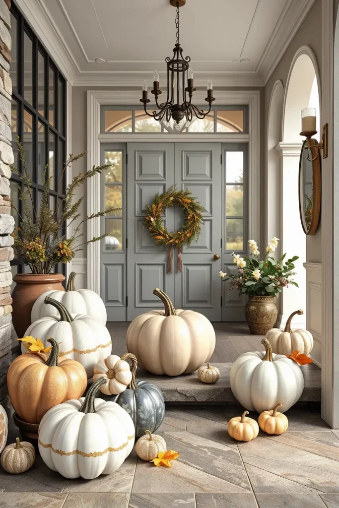 I group pumpkins by finish, which create texture: chalk, stone, velvet, leather. I set them on sideboards, under tables or beside fireplaces. Mini foam or ceramic pumpkins painted bone white, black or gold are my favorites on kitchen counters or bookshelves. In the case of covered porches, slate or clay-colored large painted pumpkins go well with rustic planters and lanterns.