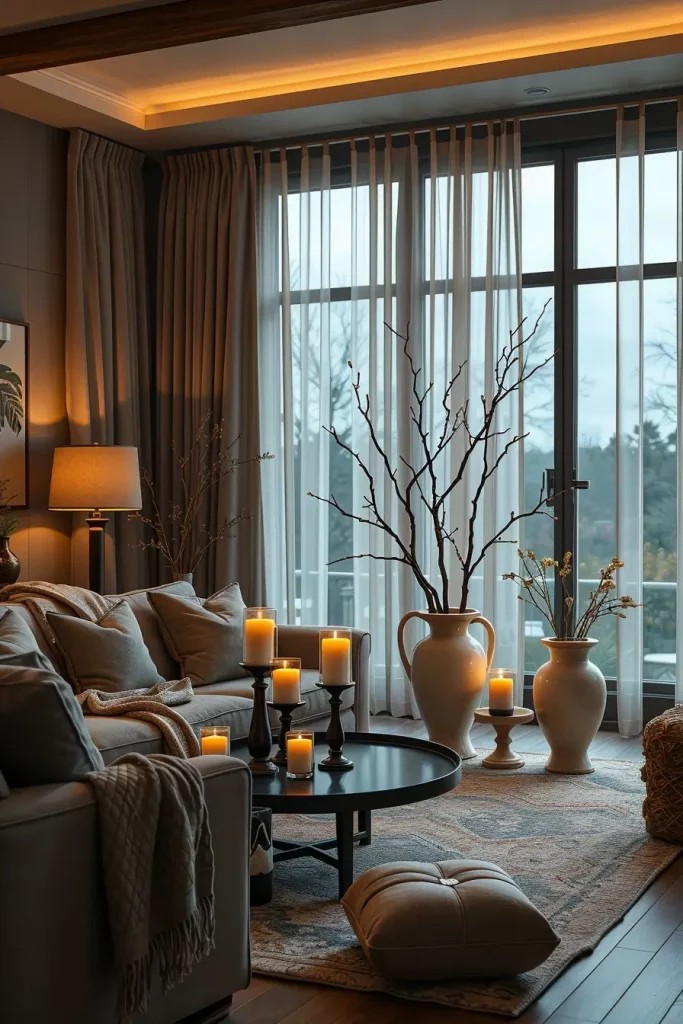 Furniture and decor I depend on: a big velvet or boucle throw, giant knit pumpkins, matte-black ceramic or alabaster lamps with Wi-Fi bulbs, gauzy curtains that diffuse daylight, and scented diffusers with resin, cedar, and smoke. On the mantel I arrange asymmetrically: on one side piled up with layered antique frames and candlesticks, on the other side with a skull bust or bone-white urn of dried branches.