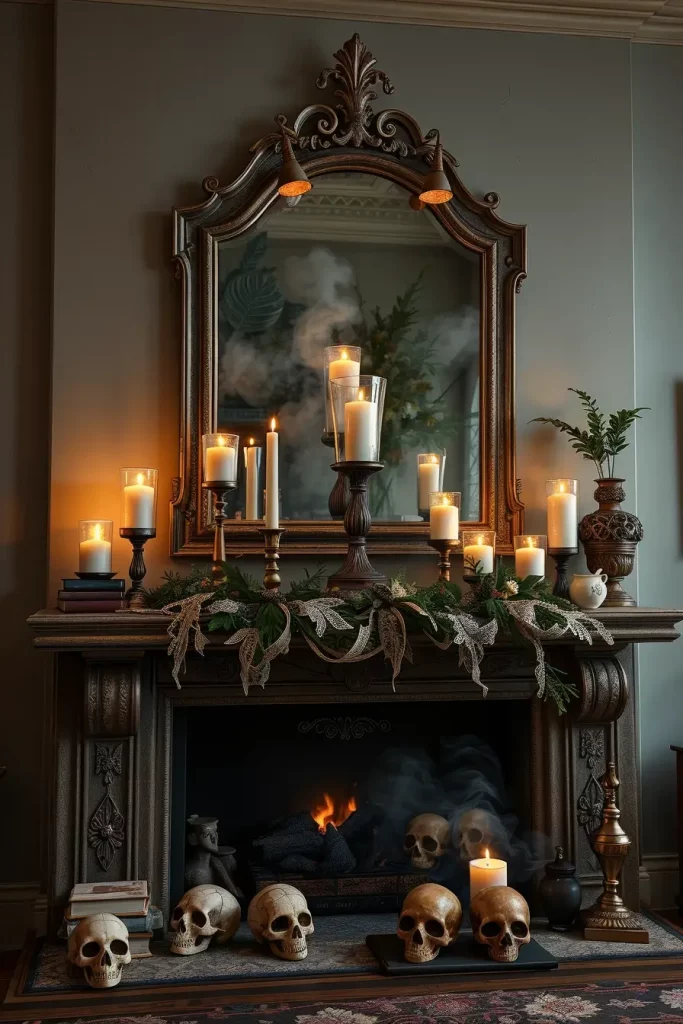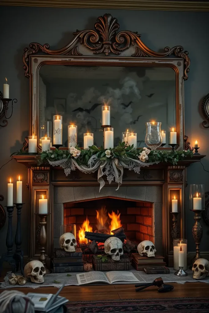I style in intentional tiers: backdrop (antique-style mirror or framed “haunted portrait”), mid-plane (taper candles, urns, mini busts), and foreground (draped lace, dried branches, potion bottles). You need flameless taper candles with flicker settings you can adjust; I cluster them to resemble real wax drips without the danger. I will use weathered books, skulls that have been glazed with crackle, and smoke-colored lanterns to ground the vignette visually in the case of the hearth.