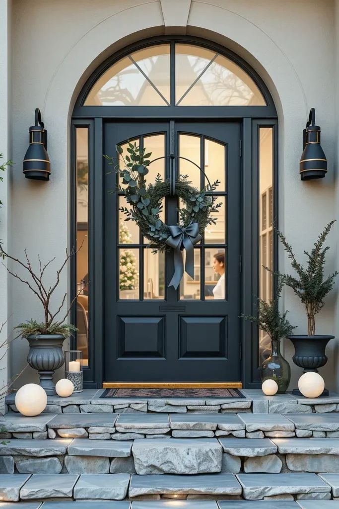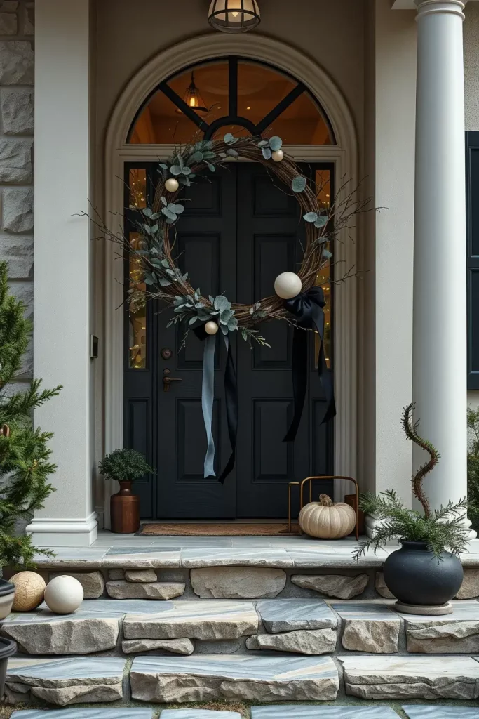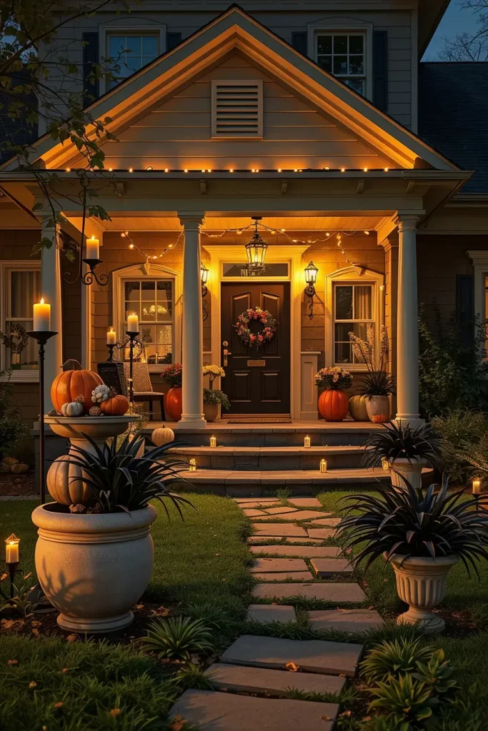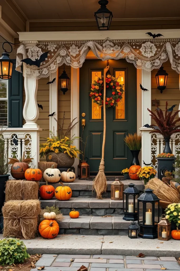 I specify durable decor: oversized skeletons, weatherproof velvet-look bows (polyester), mesh fabric garlands, concrete-effect planters filled with black-dyed pampas grass, and reclaimed wood signs laser-etched with typography. For porches, mix stacked pumpkins (real, painted faux, or plush for covered spaces), lanterns with flicker LEDs, and tall wrought-iron candle stands for verticality.