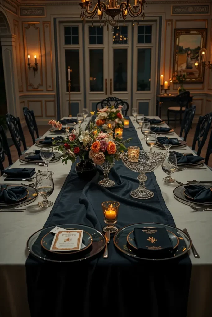 For 2025, my table styling leans ceremonial: layered textiles (charcoal velvet runner over crinkled gauze), smoked glass chargers, jet-black flatware, and low urns overflowing with desaturated florals. I design the tablescape in sections–center line drama, balanced by minimal, legible place settings–to ensure that the guests can eat comfortably in a visual rich indoor environment.