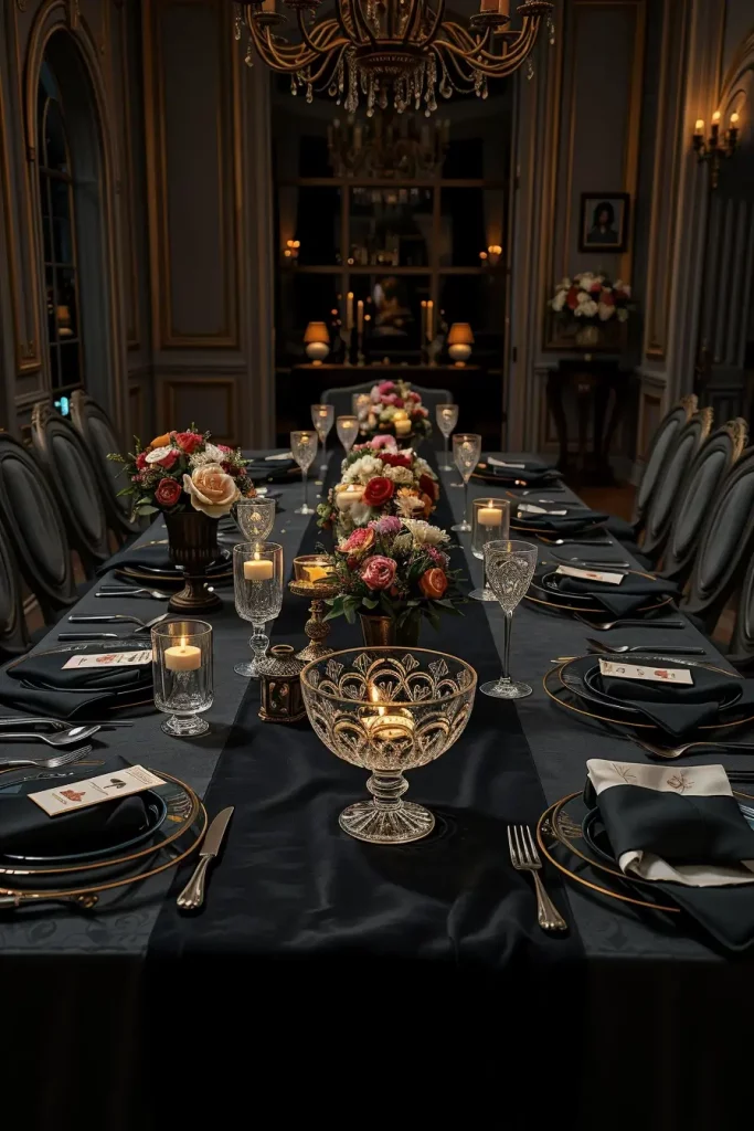 I’ve learned (especially from Bon Appétit and Food52 styling features) that height discipline is key: keep the centerpiece under eye line, then add drama at the table’s ends (taper candles, pedestal stands). That keeps the dialogue going and keeps the atmosphere immersive and spooky.