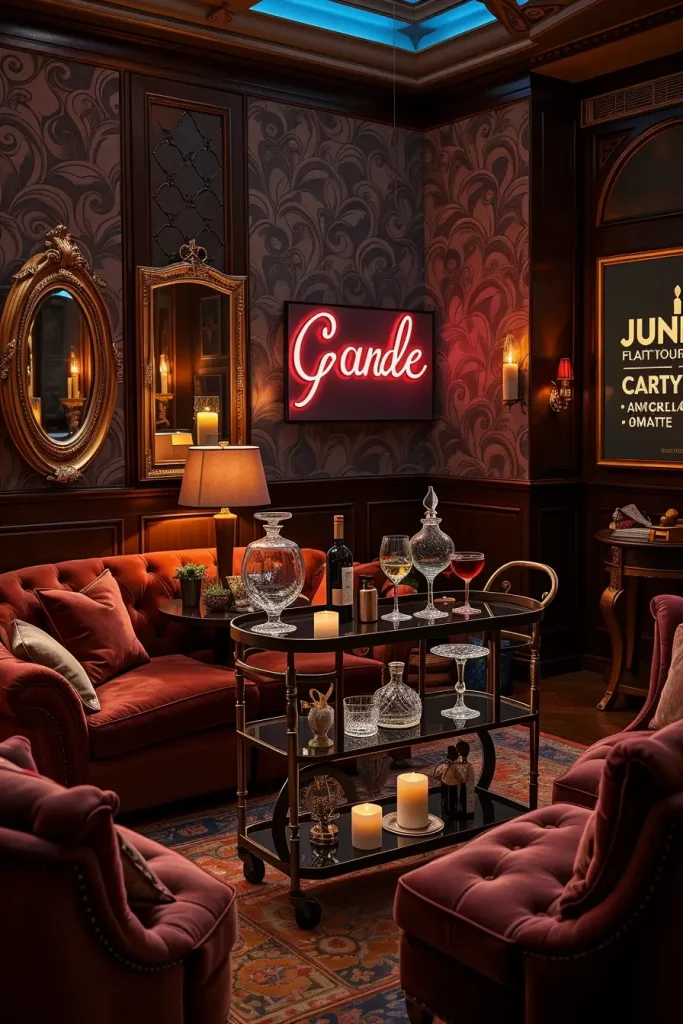When I design Halloween party spaces that focus on adults, I do so in lounge, not living room terms: low light, textural fabrics, sculptural bars, and playlists programmed to lighting areas. Halloween decor ideas 2025 are more sinister and less virtual: velvet couches, oxidized metals, smoky mirrors, pampas dyed wine and onyx, and crystal decanters on an apothecary-style bar cart.