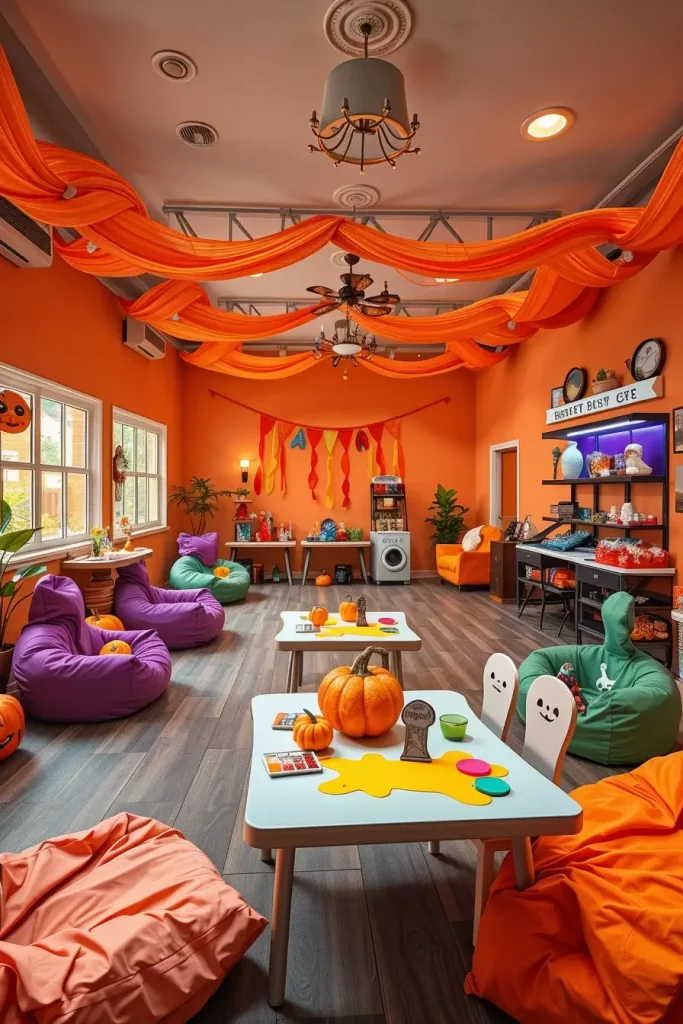 In the case of kids, I switch to sunny, welcoming color schemes, such as sherbet orange, slime green, neon purple, and use rounded props and soft materials. I zone the space: craft table (foam pumpkins, stickers, washable paints), snack station (clearly labeled, allergy-conscious), and a DIY photo booth with removable decals and soft fabric backdrops. Safety is the first priority, no actual fire, no trip hazards, and all items are fastened in place.