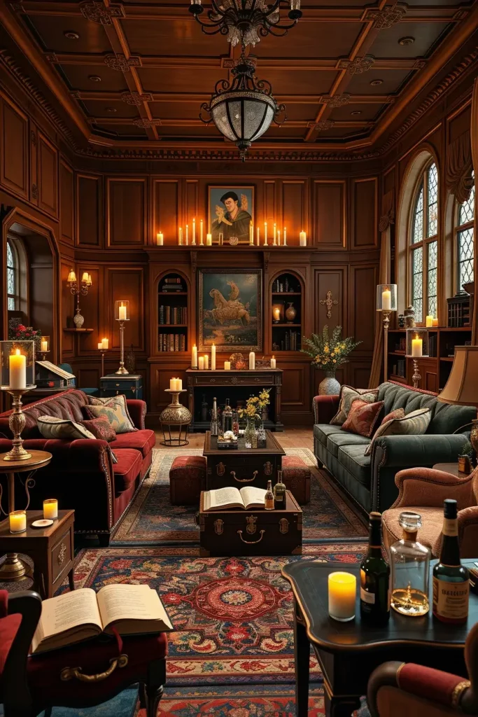 One by one I grab battery-powered taper candles with warm 22002700K LEDs, magnetic or clear-line suspension kits, framed moving portraits on digital picture frames, piled vintage-look trunks, and open spellbooks on brass stands. The seating area is anchored by a dark Persian style rug and the palette is unified by house-colored velvet pillows. I include a long refectory-style table of potion mixology, apothecary bottles, brass candlesticks, and parchment-style menu cards.