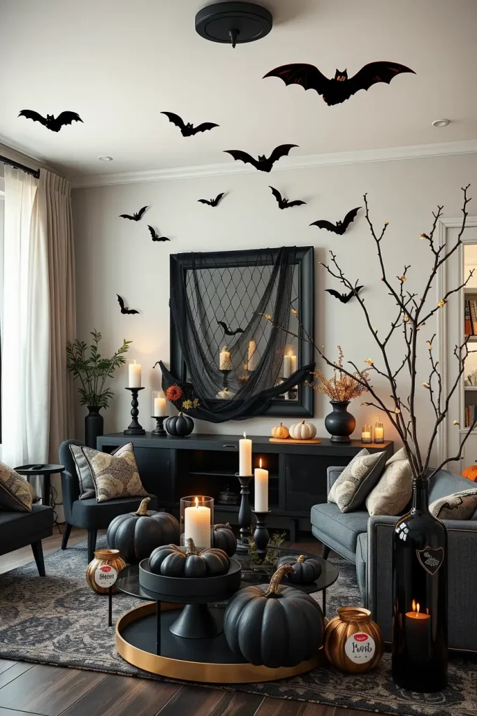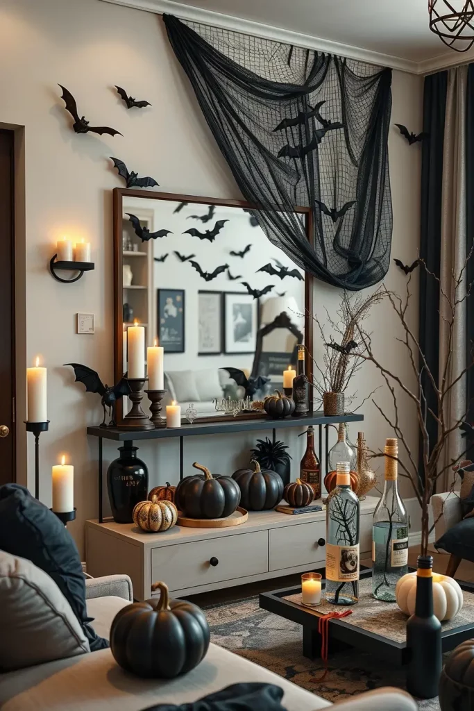 I’ll order: oversized mesh fabric (instant drape over mirrors, consoles, and stair rails), pre-lit battery-operated branches, LED flameless candles, faux cobweb kits, and peel-and-stick bats. I will print: large gothic labels on bottles, vintage-style posters of seances and a low-cost haunted portrait gallery. Then I craft: black-painted thrifted frames, torn-book-page garlands, and spray-painted pumpkins (matte black, bone, or metallic copper) for a fast yet editorial finish.