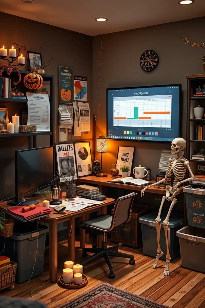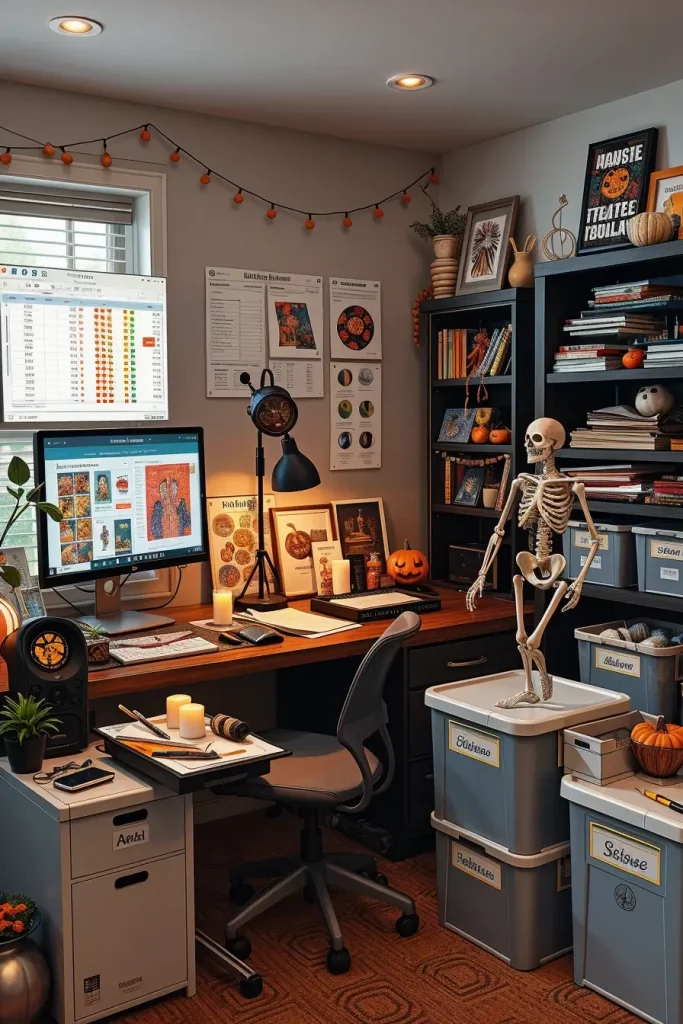 As far as furniture and styling are concerned, I begin with shared spaces: reception, kitchen zones, and meeting rooms. I use neutral palettes as the base and then incorporate safe, reusable elements: letterboard messages with Halloween puns, mini cauldrons with candy (labeled for allergens), dry-erase boards for pumpkin doodle contests, and paper bats cascading from ceiling corners. In the case of desks, I would suggest that simple vinyl decals, pumpkin planters, or ghost-shaped ceramic pencil holders that do not interrupt the working process are used.