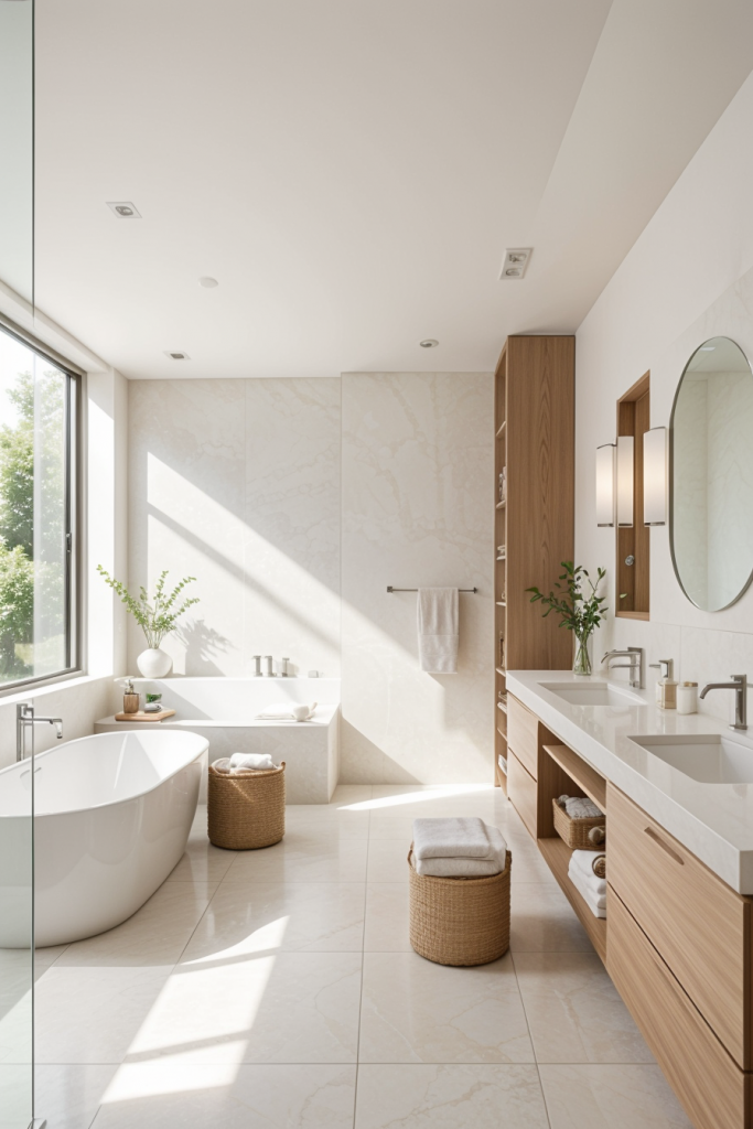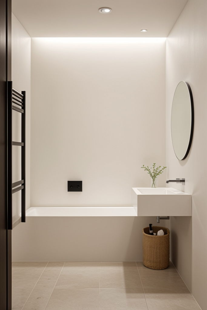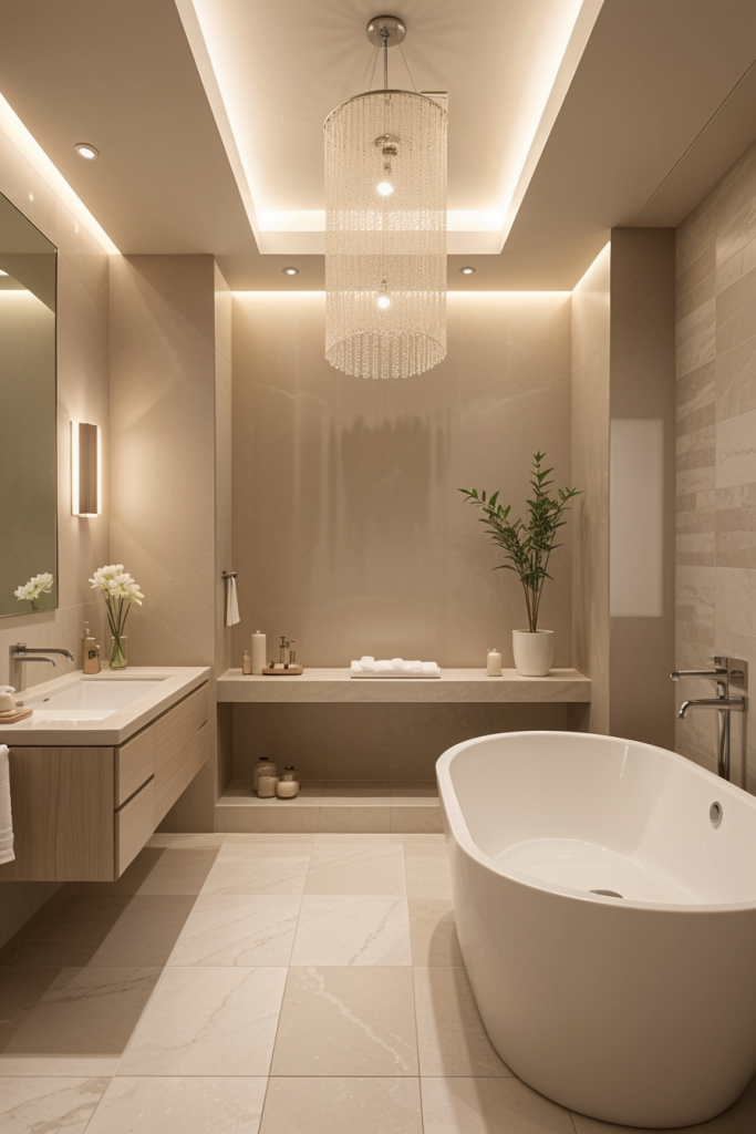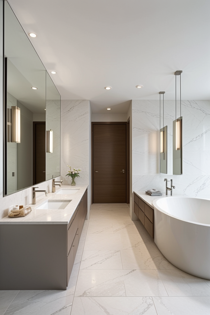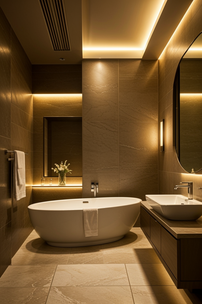 Ambient and accent lighting functions are simultaneously employed to achieve an inviting atmosphere within contemporary bathrooms, making effective lighting consideration unavoidable. Lighting set-ups with easy diffusion function as mood setting soft lighting, whereas the accent lighting serves specific architectural features and design details. In addition to assisting with functionality, this layered lighting approach allows for an enriched space with depth and texture. Such contrast of light and shadow brings warmth and elegance to the modern bathroom set up.