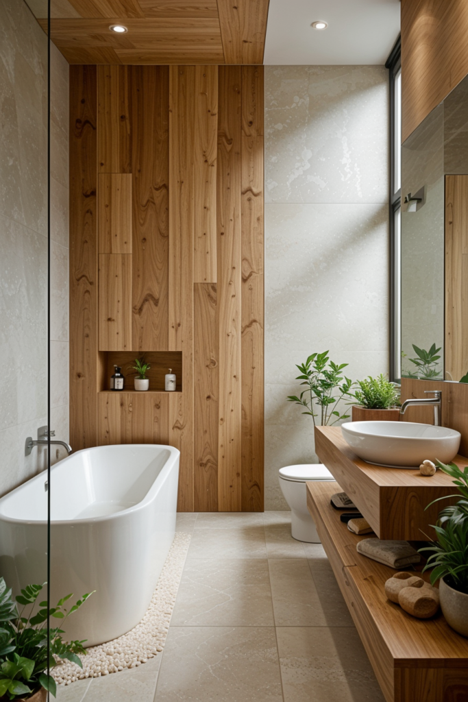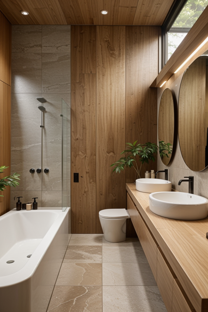 Integrating natural components in contemporary bathroom layout adds both charm and warmth to cold, sophisticated spaces. The use of natural stone, wood accents, and plants create synergetic balance between artificial materials and the natural world. These details not only mitigate the modern look, but also enhance tranquility and healing. The blend of nature with modern design creates an environment that is, at once, refreshing and timeless.