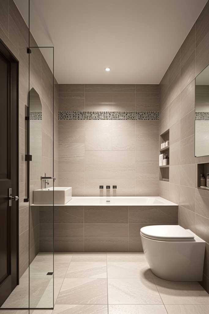 The application of decorative elements and vivid color highlights full of character and life, add appeal to contemporary bathroom spaces. These elements can be in form of striking accessories, colorful tiles or artwork and not only add beauty to otherwise muted color schemes, but also provide a break from the monotony. The elements enable the user to freely demonstrate their identity and artistry while keeping the ultra-sophisticated pre-made impression. This method marries straightforwardness with a sprinkle of excitement, achieving an attractive and motivational environment within the bathroom.