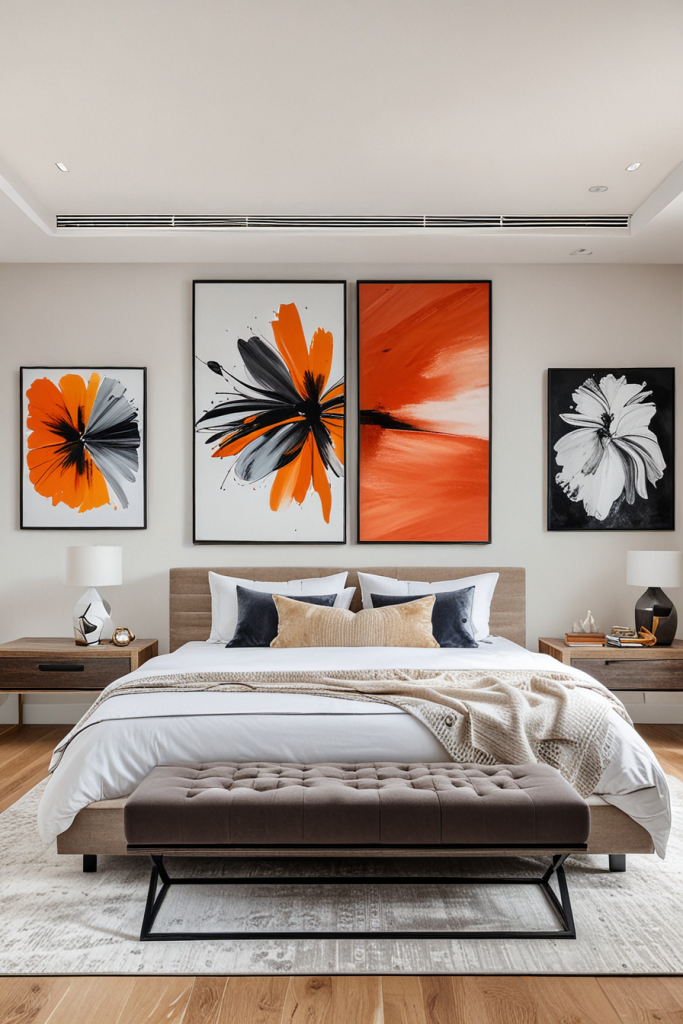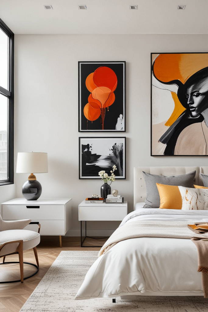 For elegant bedroom designs, modern art and decor express style and creativity as they add a dramatic focal point. The use of statement pieces such as sculptures, abstract art, and quirky decor transform the bedroom into a multifunctional, artistic masterpiece. Besides augmenting the design, this approach integrates art into modern aesthetics by turning the bedroom into an expressive gallery.