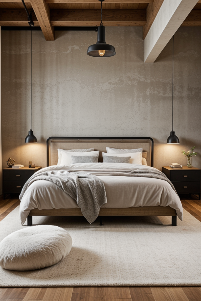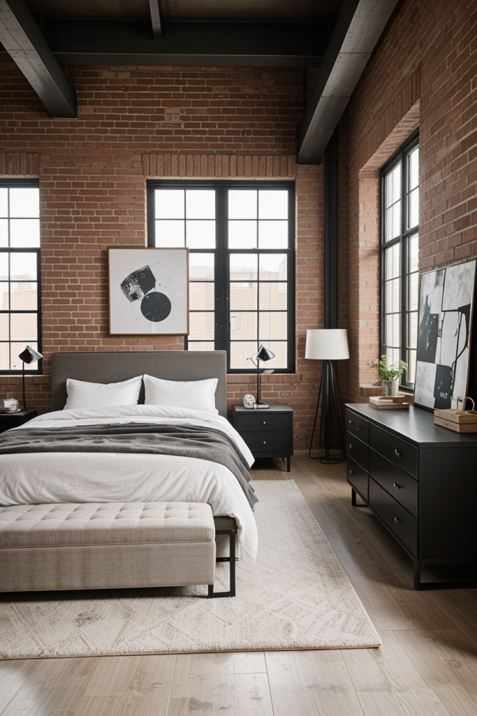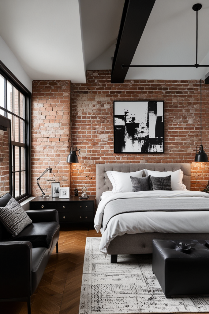 In this part, we look at how trendy bedroom design concepts combine industrial style with contemporary design to craft a magnificent combination. This style incorporates exposed building materials such as brick walls and metal details with modern furniture and gives off an appealing edgy vibe. The charming overall effect is retro with a hint of urban style which is wonderful for people who enjoy both design and practicality in their homes.