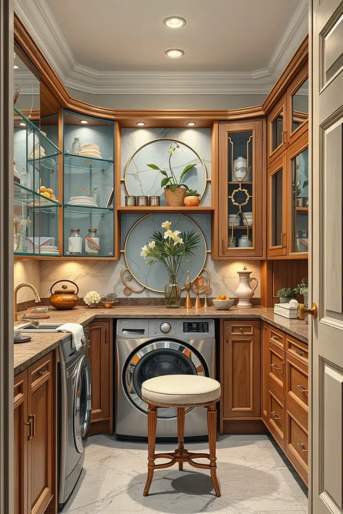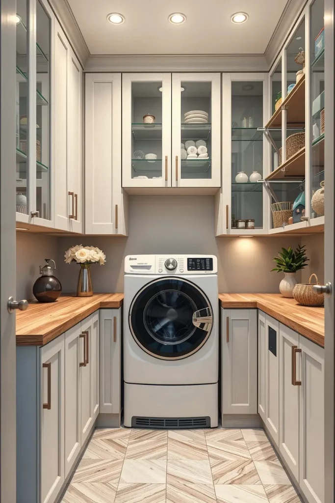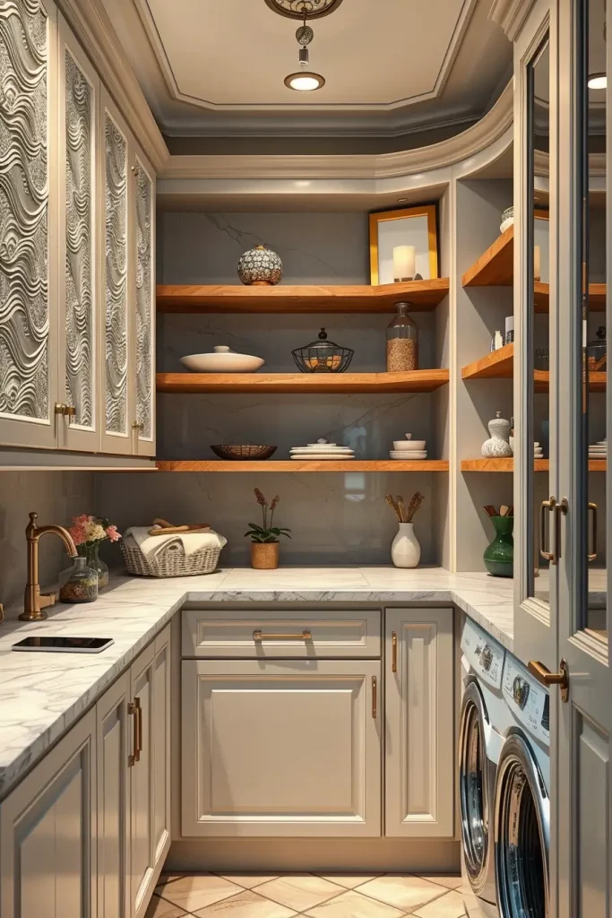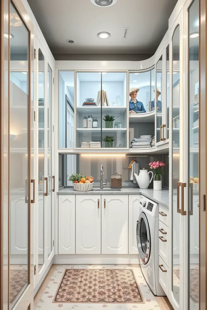 In case of a pantry in the laundry room, I usually resort to the use of glass and mirrors to create the impression of space. The addition of reflective materials to a small space brings about extra space at once, bringing both brightness and elegance. Soft-edged glass cabinets, curved mirror panels, and frosted doors are the preferred choice of designers in 2026, which will allow light to go through the building without looking messy.