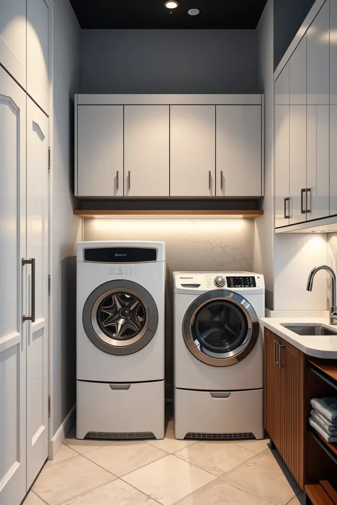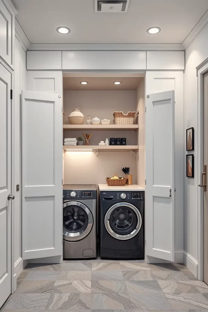 In doing this layout, I would utilize ceiling tall cabinetry, with hinges in the doorways, that act as push-to-open doors, and use few hardware. They are painted in soft gray or warm taupe and this provides a soothing designer backdrop which will go well with the rest of the decor. One washing machine occupies a nice space in between the two tall units and completes the balanced composition.