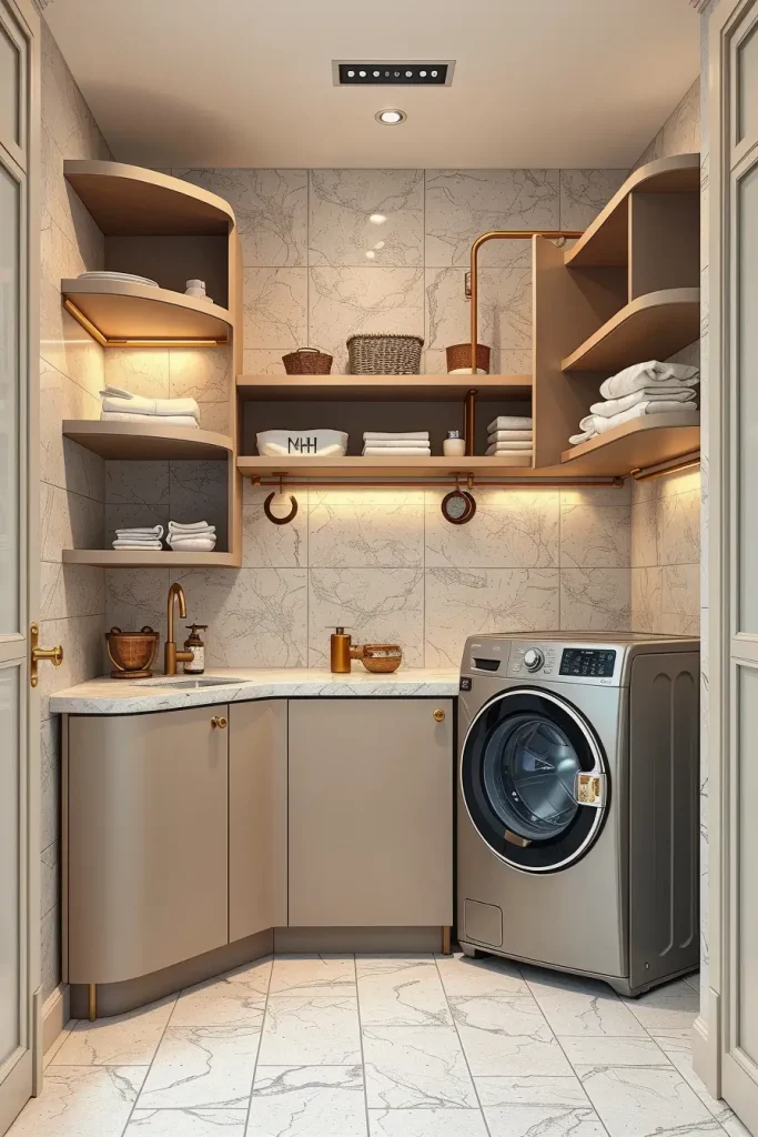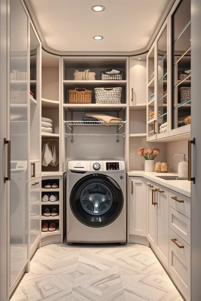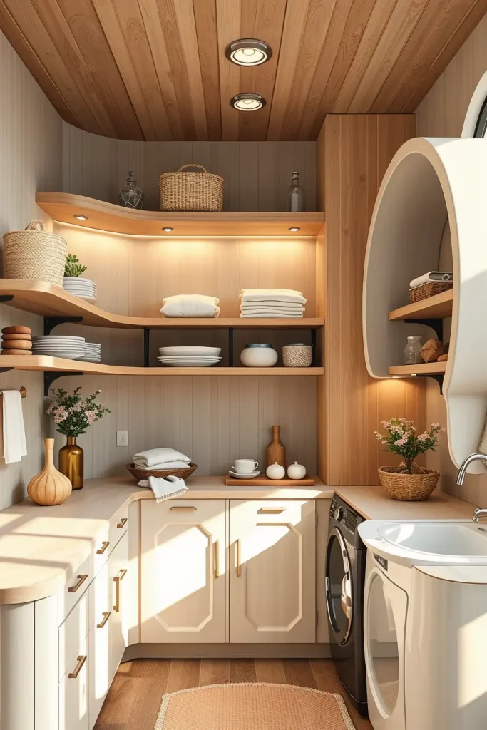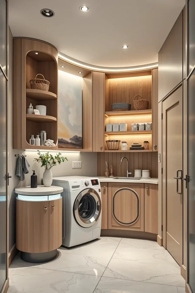Rounded corners immediately alter the perceptions of space and it is easy to see that a laundry room pantry will not look rugged or unattractive. I believe this would be especially suitable to the 2026 interiors, where soft geometry prevails in design trends. Round corners enhance movement of traffic especially where there is only one washing machine in a small area.
