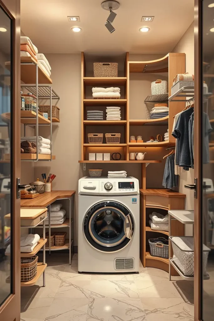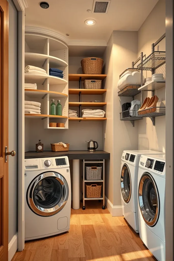 My favorite are wall-mounted racks, stackable baskets and small drawers beneath the washing machine. All the design options should save inches but retain the space appealing. I also tend to have oval shelves and folding tables, which can be retracted to facilitate the laundry activities.