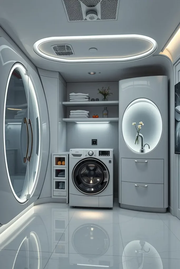 Small homes of the future require creative designs, and oval shelving units have now emerged as a characteristic feature in the narrow laundry rooms. I am a fan of how oval shapes can create a bigger and coherent room out of a tight one. The lack of acute lines promotes the flow of functional areas.
