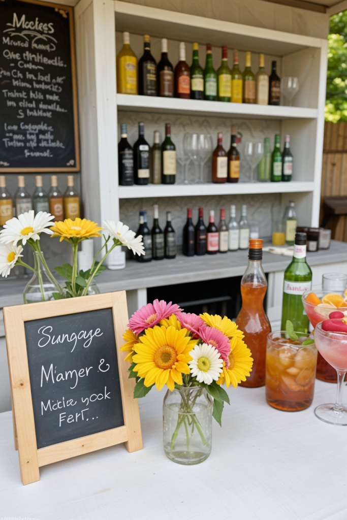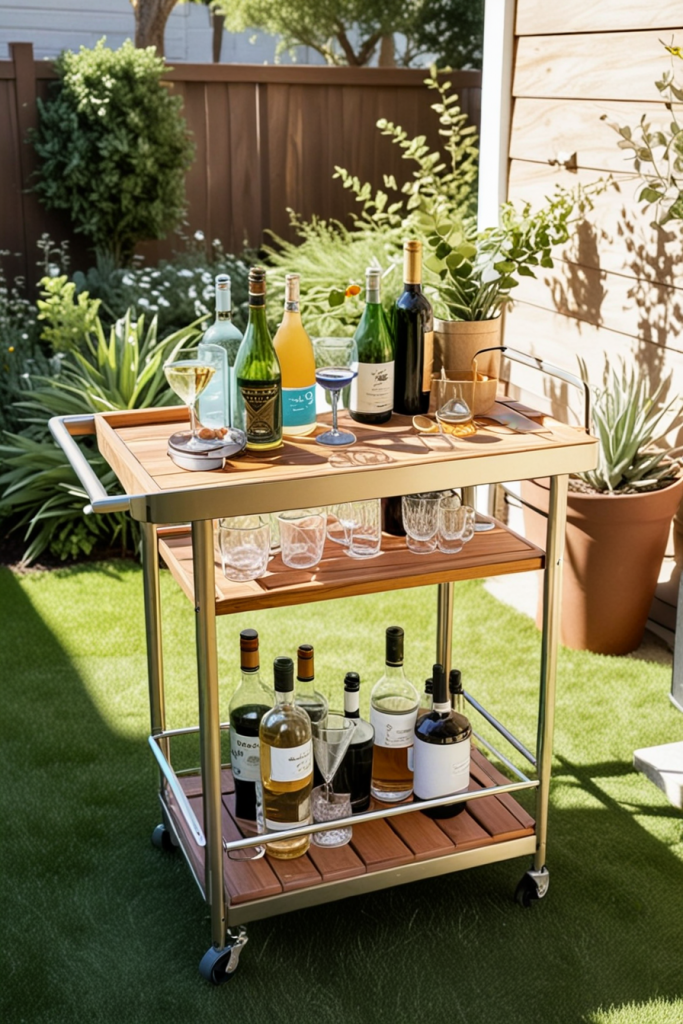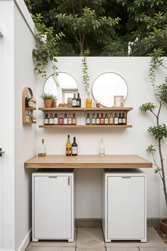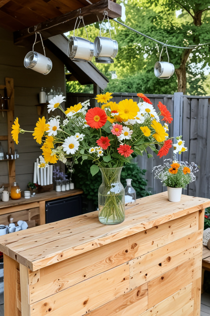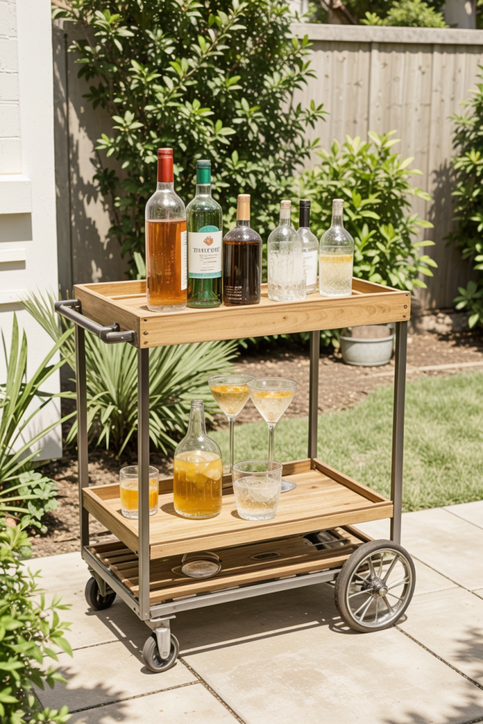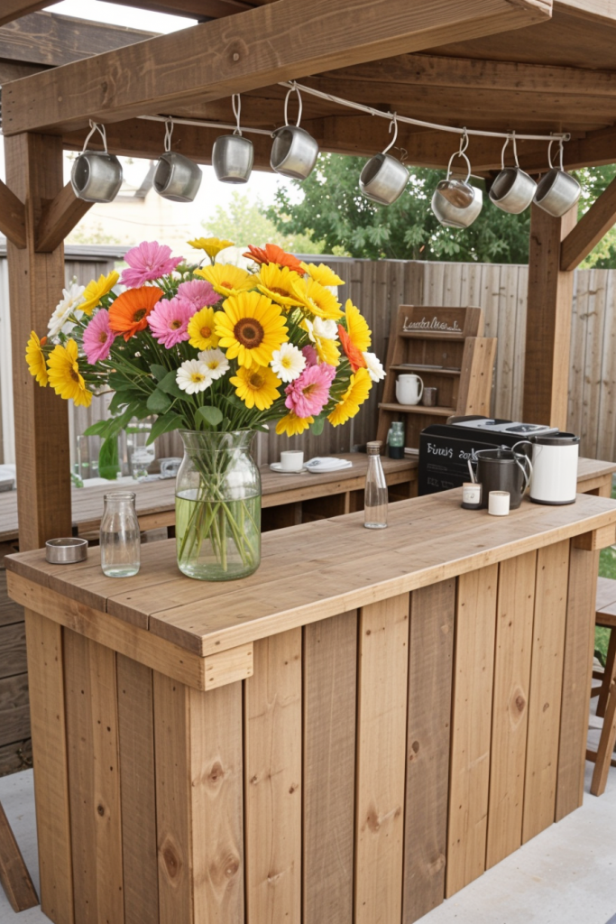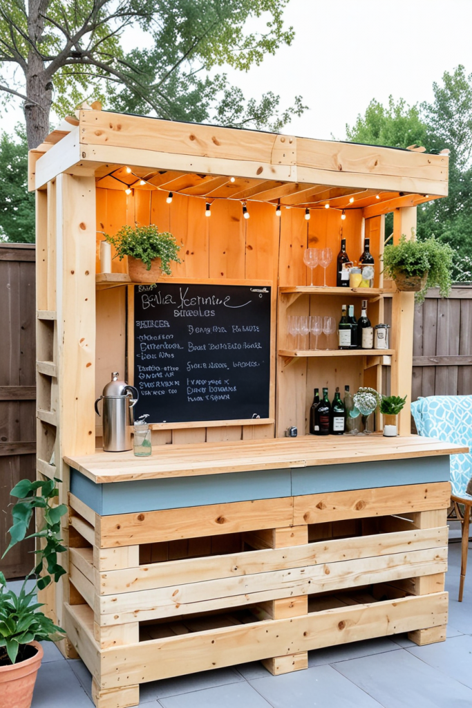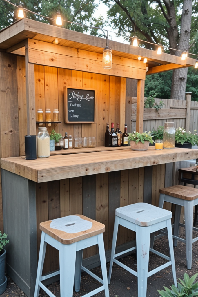 Construct a simple homemade summer bar using spare pallets, crates, or even concrete blocks. Paint it with light summer colors like sage green or sky blue. It also has basic shelving to hold glasses and bottles. String lights and a chalkboard menu add the final touches. What’s stunning is that it is economical and an excellent weekend project for budding DIYers.