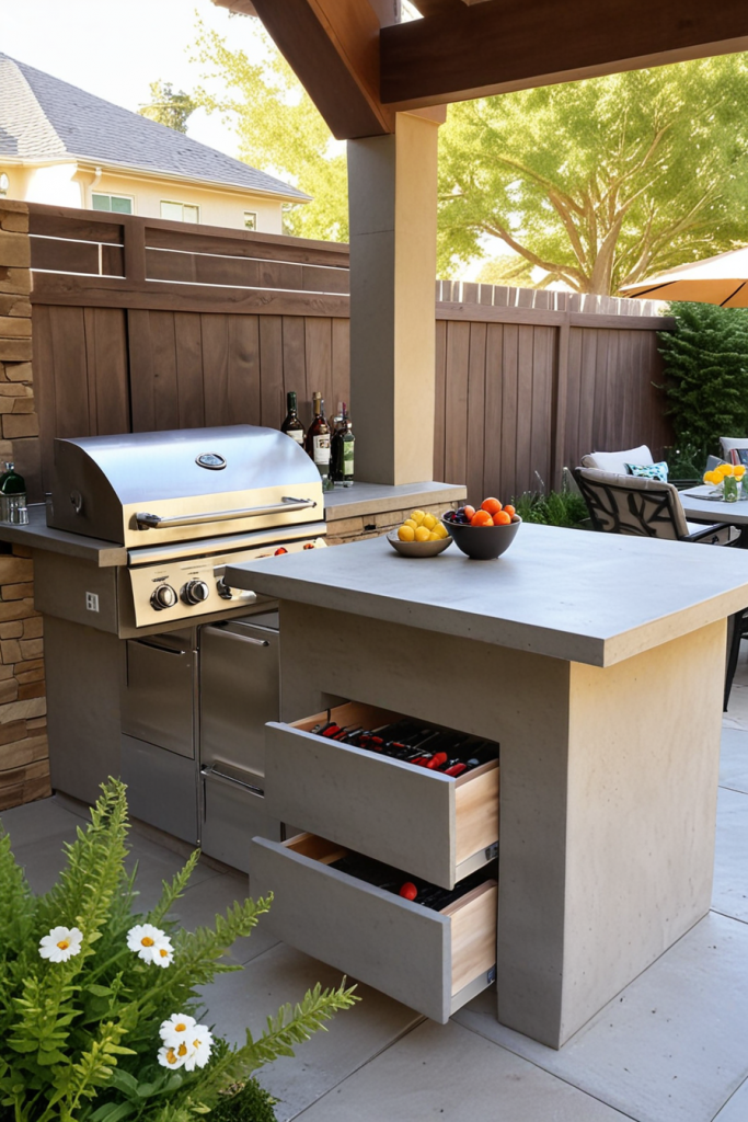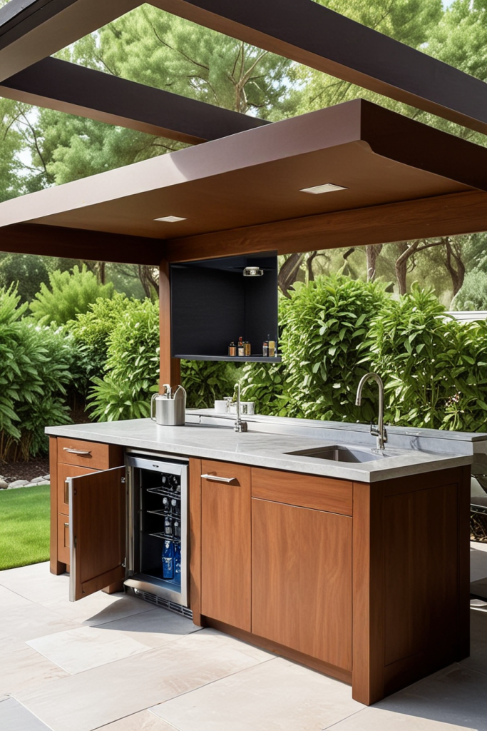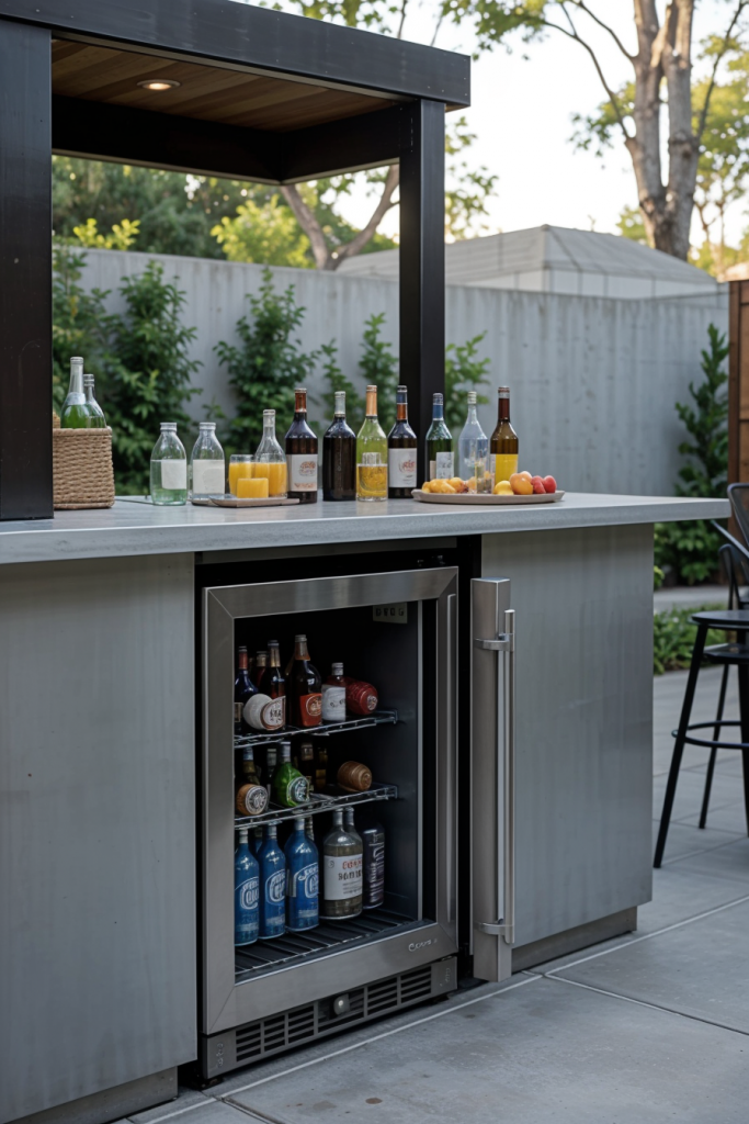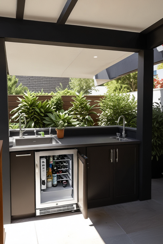 The hosting activities in the summer are greatly simplified by the outdoor installation of a mini-fridge. Make sure to select a weatherproof model that can fit underneath the bar counter as well as cabinetry. The mini-fridge not only eliminates the need to go inside the house but also keeps the drinks cold. Opt for stainless steel finishes that match the other outdoor appliances for both style and convenience.