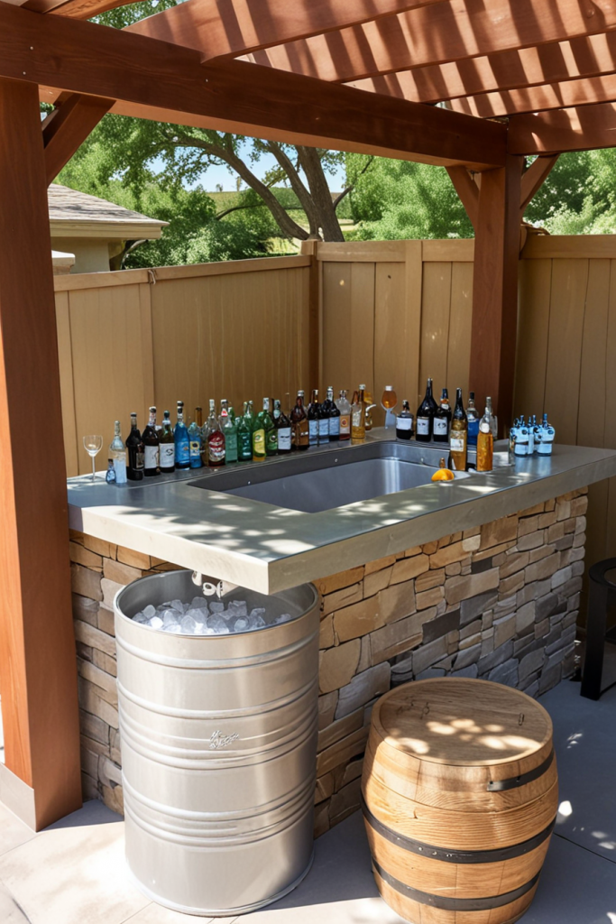 Ice stations facilitate the maintenance of low temperatures for drinks during outdoor festivities like parties. Use ice sinks incorporated within repurposed metallic or ornate stone vessels. Position them either at the side of the bar or at the back for convenient reaching. Such accessories go along way in improving the decorative feature the bar offers.