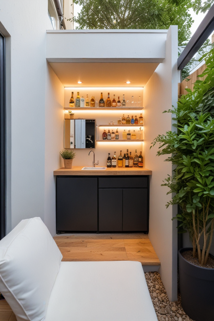 If your area is limited, consider a fold-out wall bar or corner setup. For layout, consider using narrow counters, stackable stools, and installing wall-mounted shelves, or racks for bottles. Mirrors behind the bar can help amplify the space in a stylish manner.