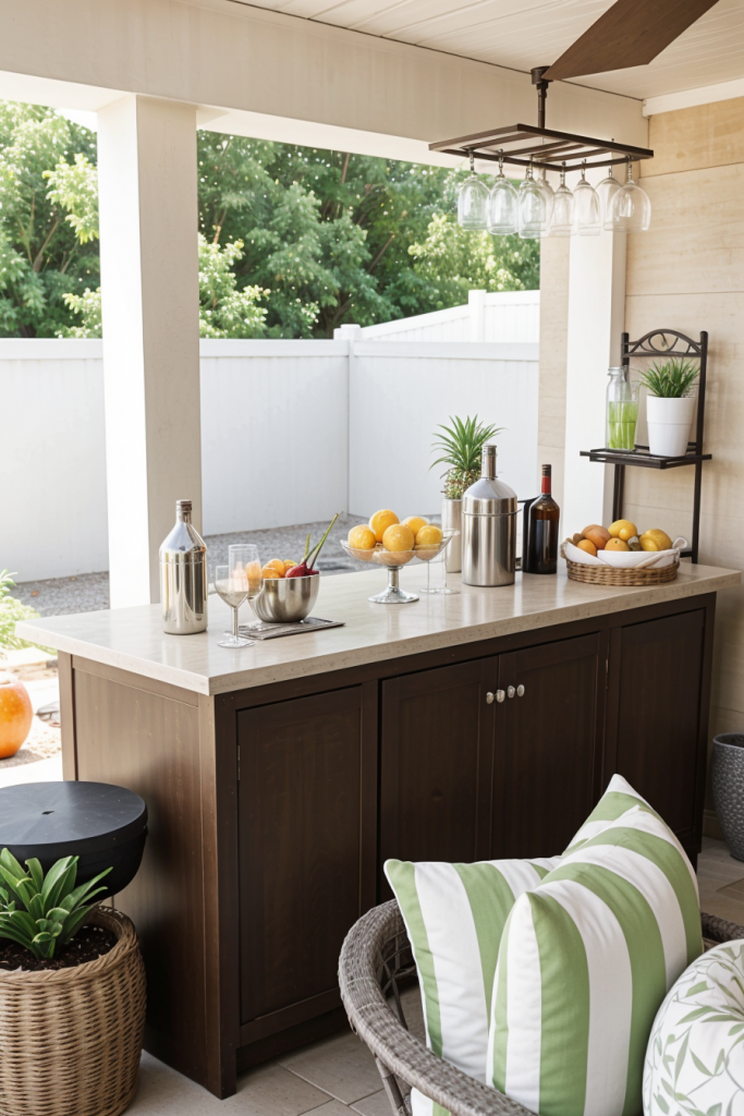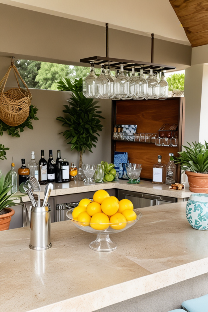 The last layer details the accessories and includes cocktail shakers, coasters, napkins fitting the season, and hanging glass racks. To add more character, include a bar tools set or citrus bowl centerpiece, along with a Bluetooth speaker. These touches integrate everything while bringing a feeling of home to your summer backyard bar.