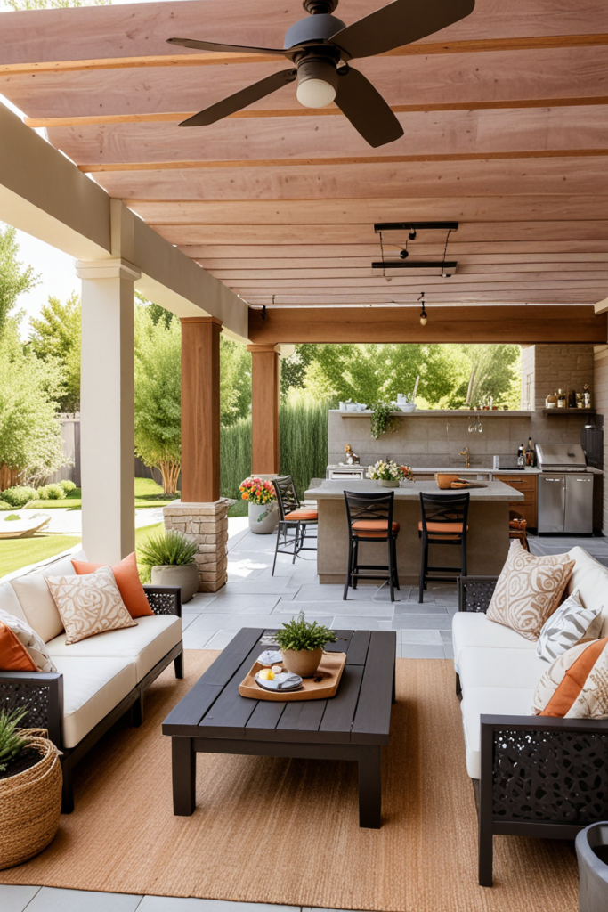 The inclusion of a lounge area next to your bar enables guests to relax in between drinks. Place modular outdoor sectionals, low coffee tables, and soft rugs underneath. Enhance shade coverage with umbrellas or a pergola, and add a fire table for later use. This multifunctional design enables both activity and relaxation simultaneously.
