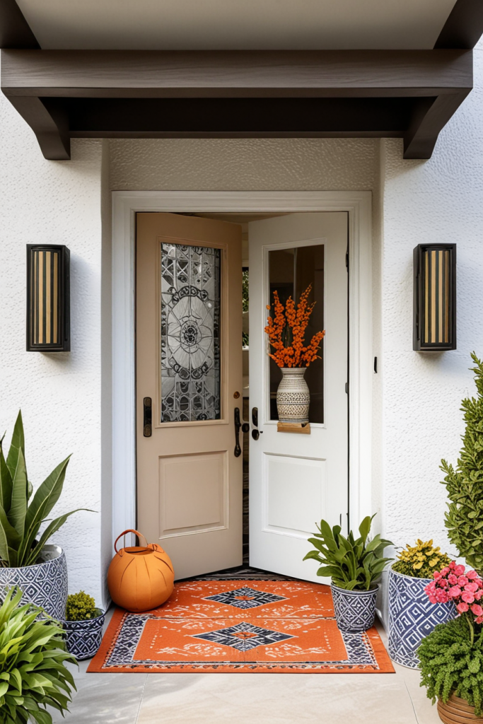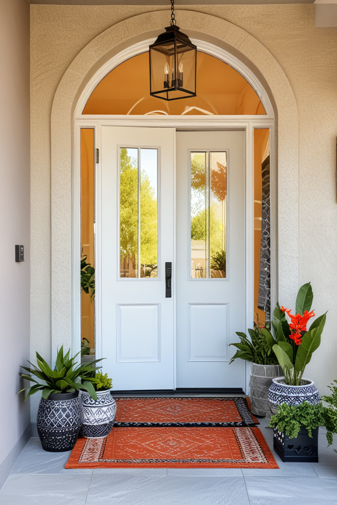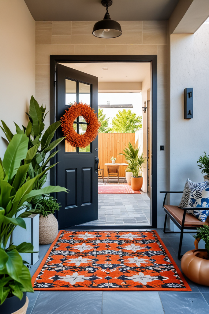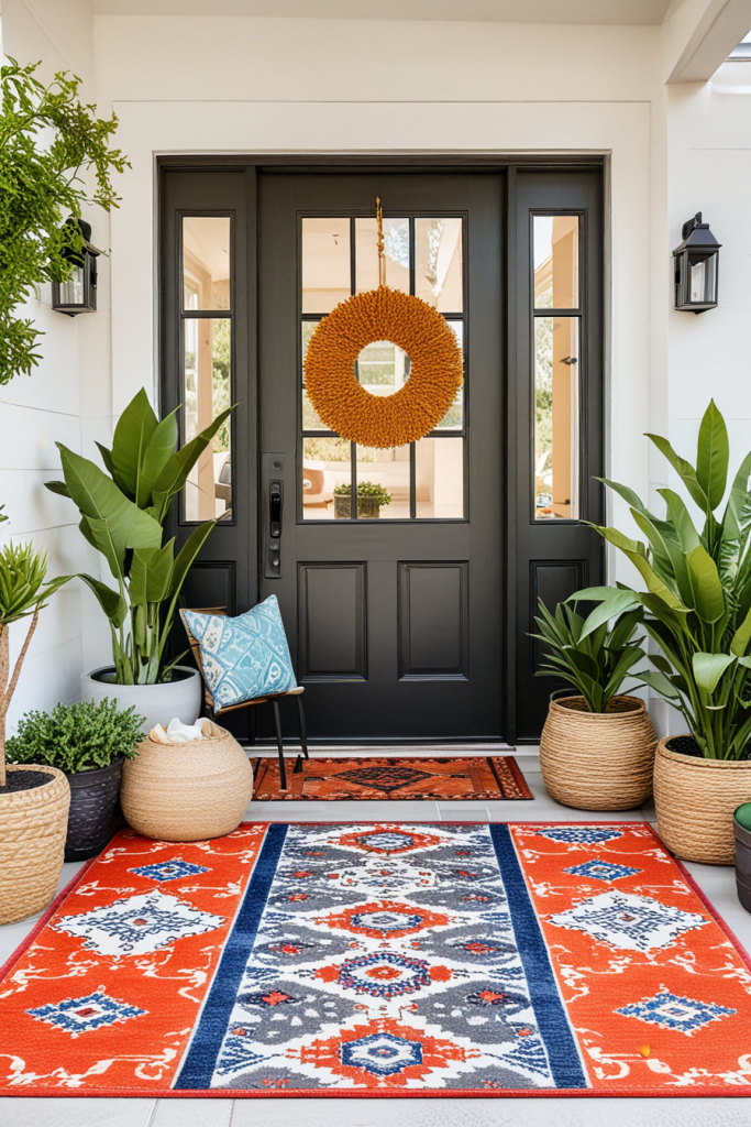 Colorful outdoor rugs offer a splash of color and texture while anchoring the entryway decor. When placed underneath modern furniture and accessories, these rugs warm up the area around the front door and bring in a playful vibe. Besides aiding as an enhancement for curb appeal, these bold patterns also bring multiple designs together to create a wonderful blend.