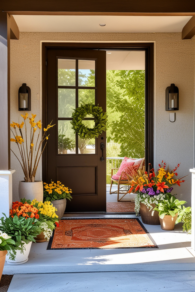 A bright mix of colors is essential to the inviting and energetic summer vibe for front door decor. The modern accessories and furniture pieces with bold colors and contrasting hues as well as playful colors make your entrance sophisticated. This creates a positive contemporary vibe that is the essence of summer.