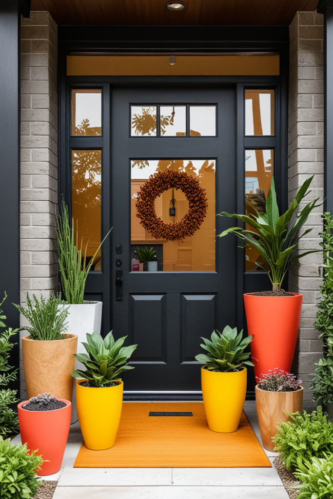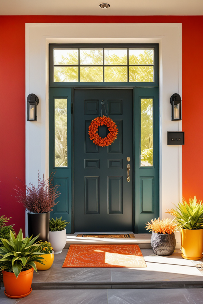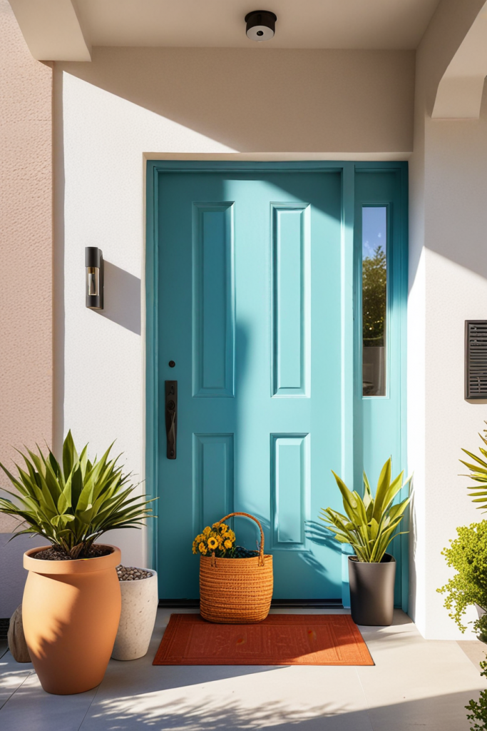Prompt for Mijorni: “Modern realistic photo of a front door With a refined summer decor featuring vibrant, colorful door hardware with stylish knobs and handles, displaying a full-view of a contemporary entryway with cohesive seasonal decor.”