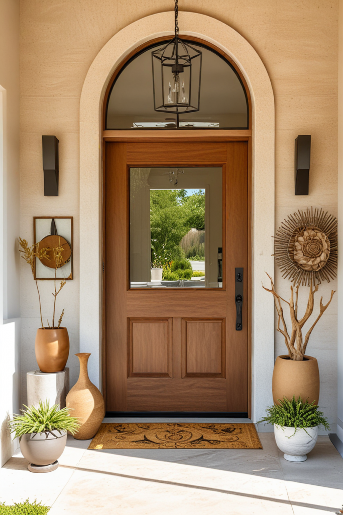 Combining modern and rustic looks leads to a magnificent blend that makes your front door decor warm and elegant. This technique combines modern and minimalistic features with earthy textures, creating a polished yet welcoming look. Elements like reclaimed wood, chucrch steeple, and modest adornments balance modern contemporary appeal with robust rustic beauty. This blend gives rise to a mix which is vibrant yet cohesive, and captures the essence of summer with creativity.