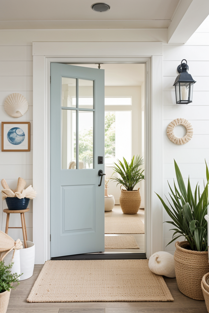 The coastal decor evokes calmness and nature while turning your entrance into a relaxing oasis. Using nautical touches like seashells and driftwoods, blending lighter and breezier colors aid in creating a peaceful yet modern ambiance. The decor encapsulates a seaside escape adding refreshing vibe which would automatically recall delightful vacation memories to your entryway. This theme would best fit anyone wishing to have a small piece of ocean in their daily life.