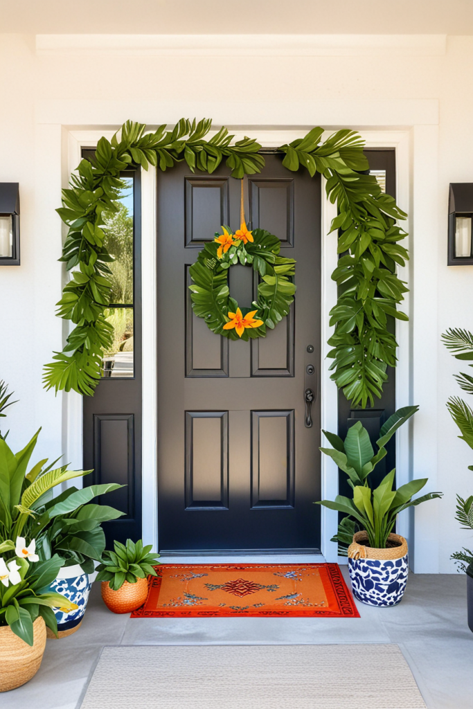 Your front door will charm guests from the very first moment and give the door an exotic, tropical vibe. The glossy accessories, bold wreaths, and striking prints work together to refresh and energize your mood as summer approaches. The tropical effect can be taken further by adding a wreath to the door which gives the whole look a sophisticated modern appeal.