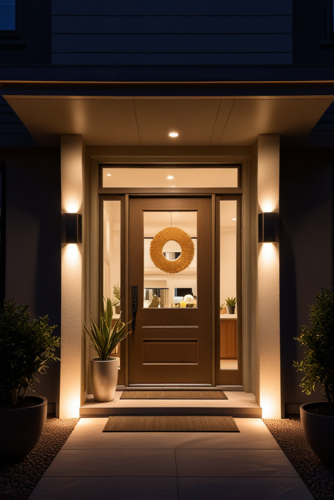 Making sure your outdoor light fixtures capture attention from your front door ensures summer decor is accentuated as the sun sets too. Placed strategically, bright fixtures illuminate and enhance the inviting Sol setting and architectural elements of warmth. This technique adds an increase in accent functionality while also giving the artistic approach to your entrance in the dark.