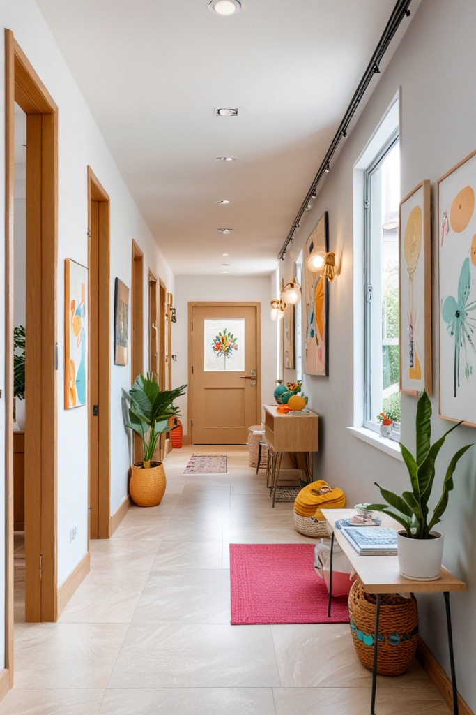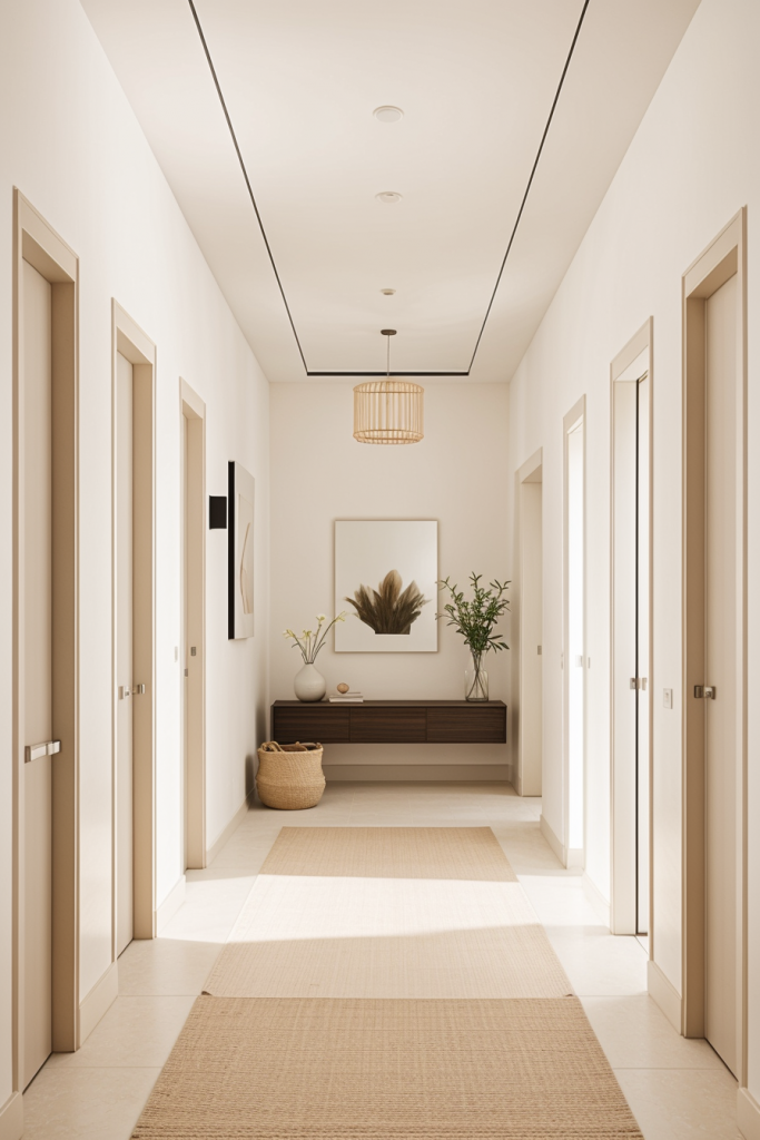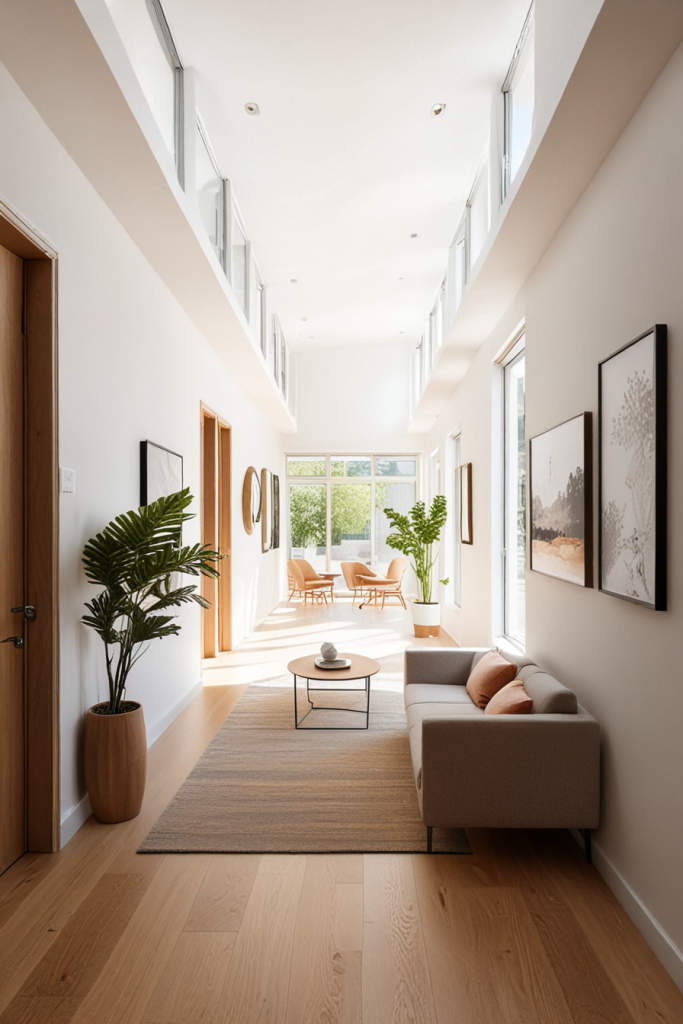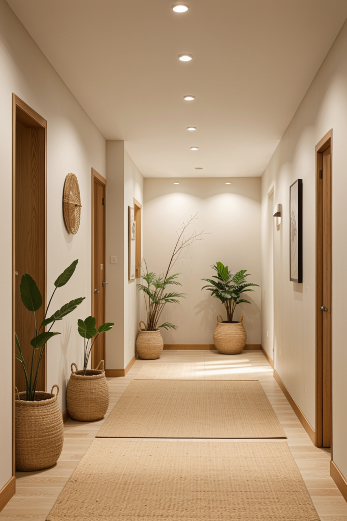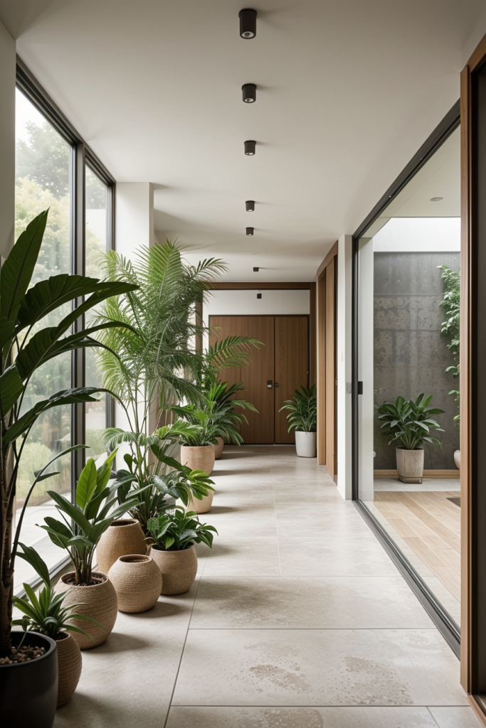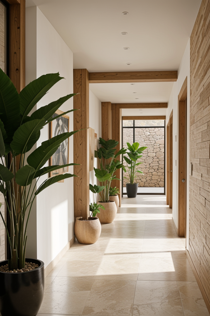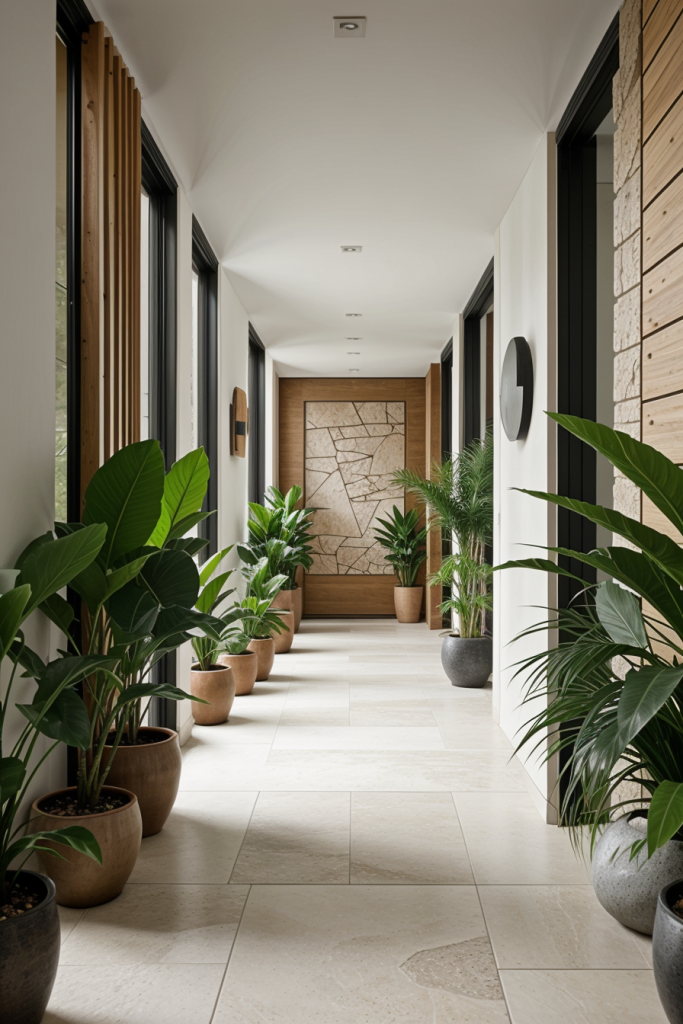 Ingrating natural space to your hallway can turn it into a relaxing getaway. Adding potted plants, wood accents, and stone decor can achieve a summery, refreshing feel. The subtle interplay between the greenery and natural elements like woods and stones provides a break from the monotonous routines of everyday life.