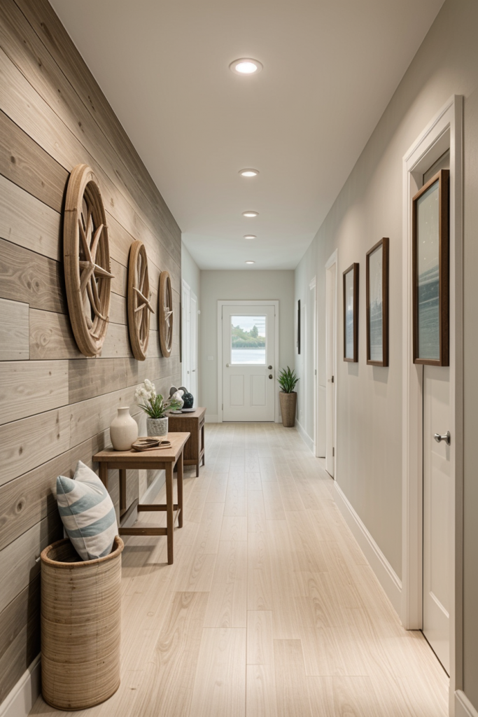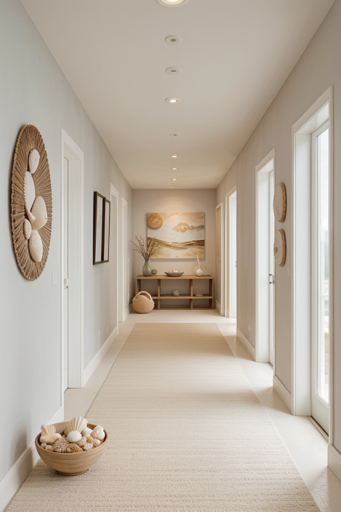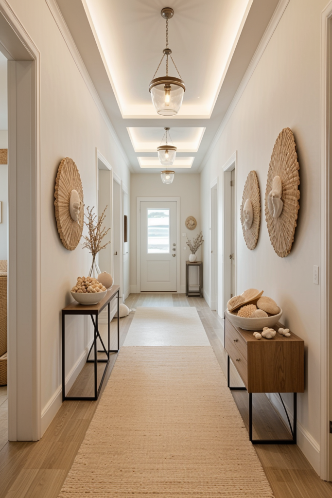 A beach-inspired style can be achieved by adding shell and sand motifs in your design. These elements derive from nature, allowing you to achieve a serene yet sophisticated look. Placed in bowls or mounted on walls, these details transform your hallway into a multi-sensory experience.