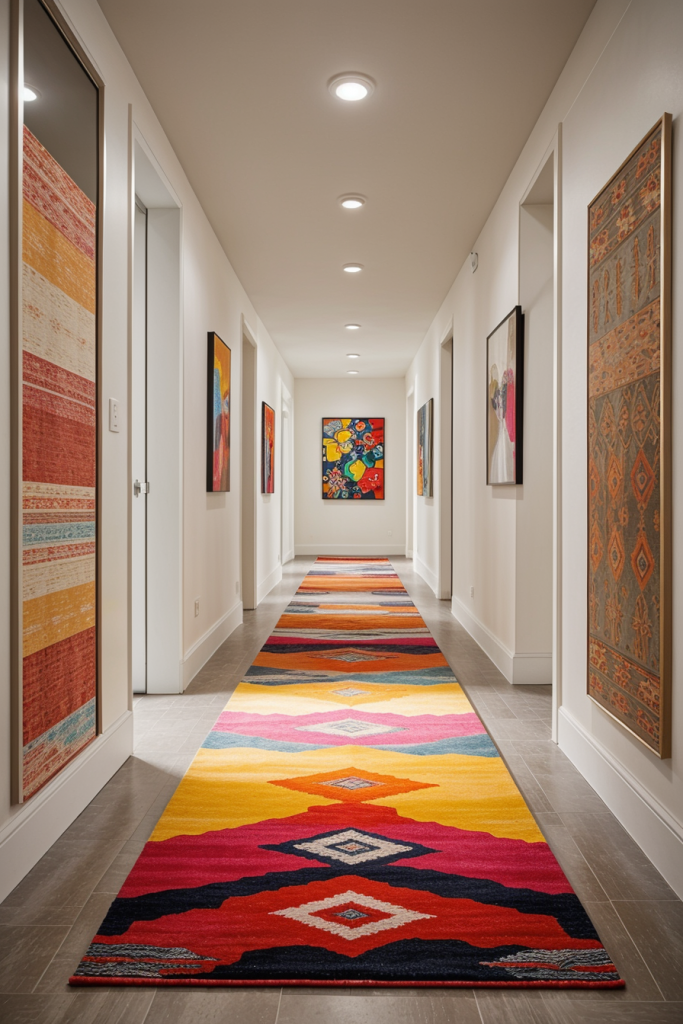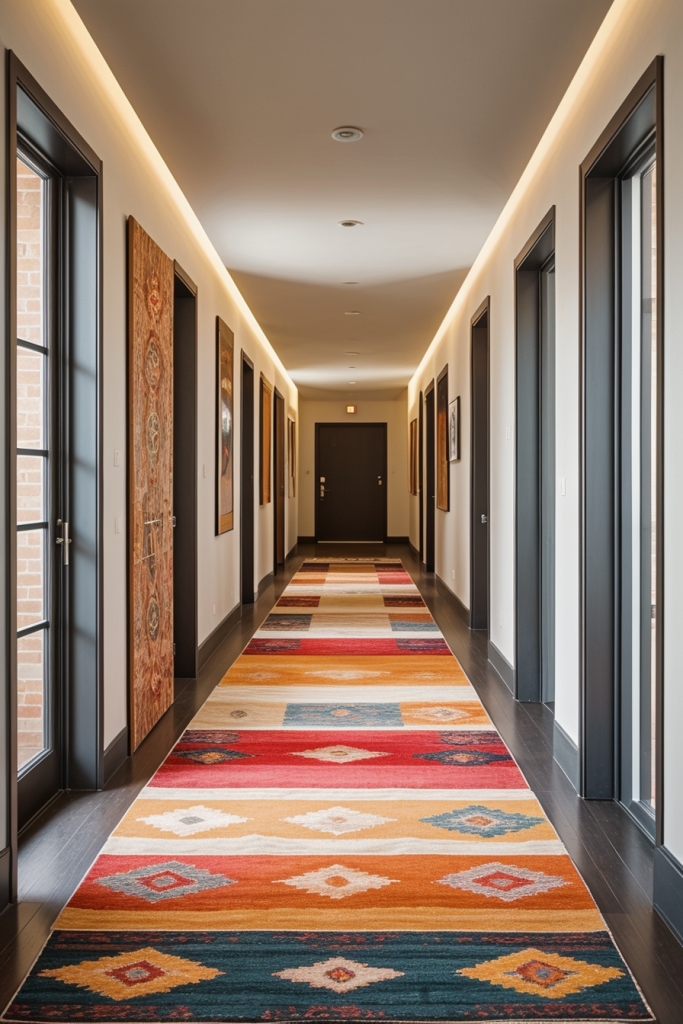 Meet victory and achievement at the center of your hallway with colorful and vibrant rugs which will not only color the floor, but the entire space. An ideal rug can separate different zones in a long open hallway, providing interest to the eyes while being gentle on feet. Strong and vivid colors can successfully change a modern entry into a beautifully organized and welcoming stylized space.