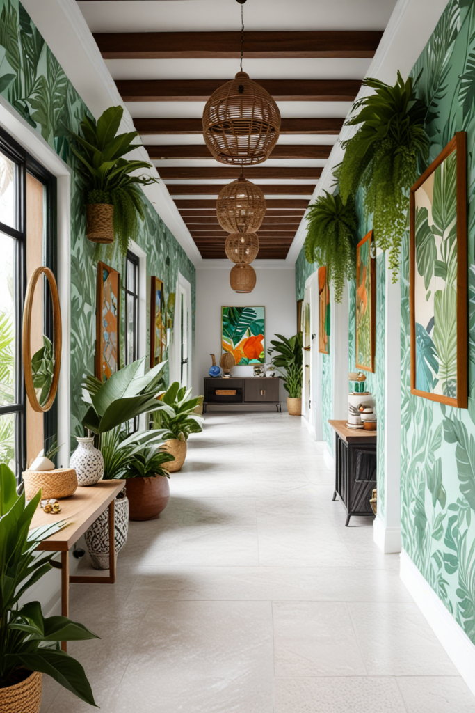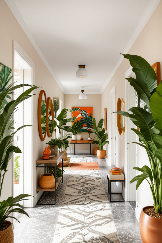 Transform your hallway with tropical elements that make the space come alive and bring nature closer. Bright floral prints, bold green furniture, and unusual ornaments form a fun, carefree atmosphere that radiates summer vibes. This method merges contemporary design aesthetics with whimsical elements, providing surprising delight with each entry.
