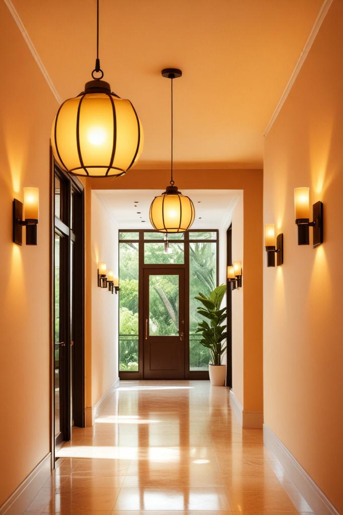 Set your hallway aglow with warm lighting and add visual appeal to pendant lamps or other wall lights. Modern light fixtures, like these, not only serve aesthetic purposes, but also emphasize significant design features. Their warm light makes the environment cozy during summer evenings while serving a practical purpose as well.