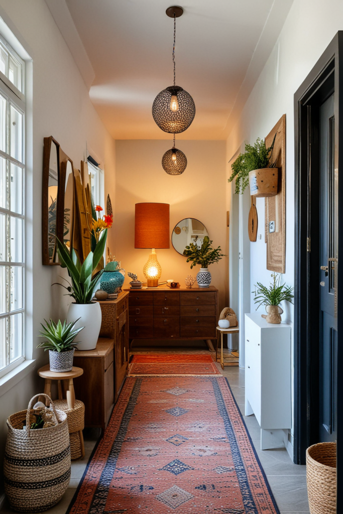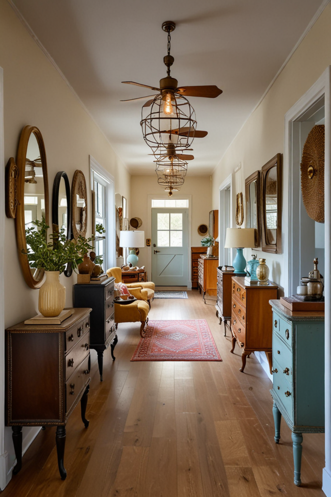 Furnish a hallway with a bold and personal touch by employing an eclectic mix of summer vintage and modern decor. People are able to think creatively and outside the box by combing different textures, colors, and designs. Such artful arrangement of art objects, furniture, and surprising details gives wonderful depth to space.